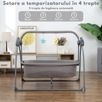 - Temporizator inteligent cu 4 setari: Economiseste timp si energie cu ajutorul temporizatorului inteligent, care permite setari de balansare automate pentru 8, 15, 30 sau 60 de minute, dupa care patutul se opreste automat.