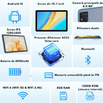 Aceasta tableta este dotata cu 8GB RAM (4GB + 4GB extensibil), oferind o performanta fluida, fara lag, indiferent daca folosesti mai multe aplicatii simultan. Cu 128GB ROM pentru stocare interna si suport pentru card MicroSD de pana la 1TB, ai spatiu generos pentru aplicatii, jocuri, filme, muzica si documente.