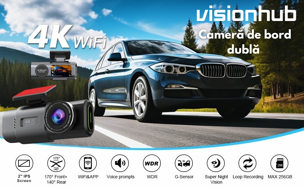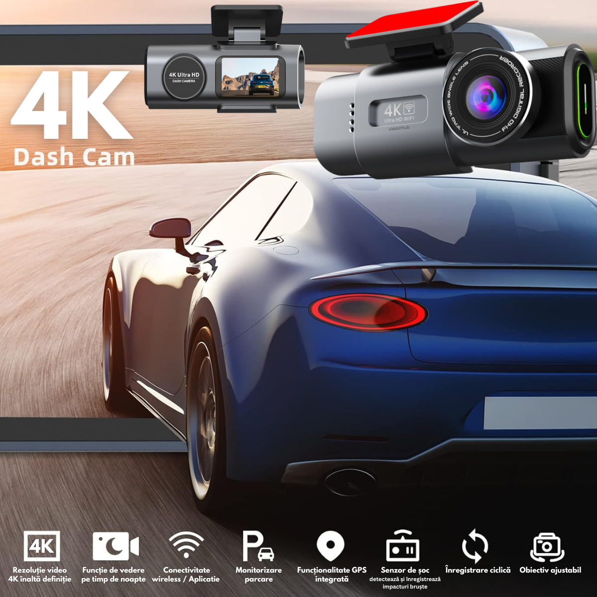 Camera Auto Dubla de bord 4k – 2160p Full HD, VisionHub®, WIFI + GPS, G-Senzor Reglabil, Aplicatie pe Telefon, Night Vision, Inregistrare in bucla, Unghi Larg 170°, Instructiuni voce, Ecran IPS 2, 0 Inch, DVR cu Camera Fata 4k + Spate 1080p inclusa, Negru
