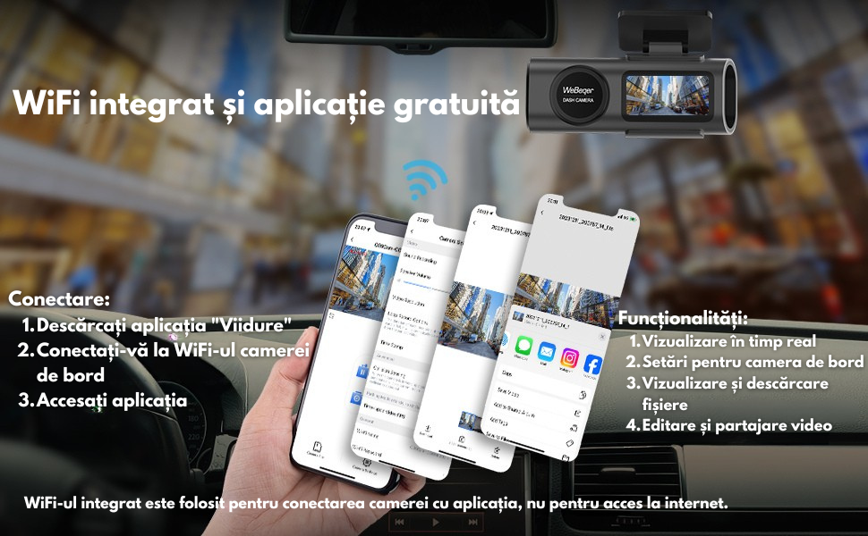 Functie de Conectivitate Wi-Fi: Acceseaza inregistrarile direct de pe telefonul mobil, fara a scoate cardul de memorie. Aplicatia intuitiva iti permite sa descarci fisiere, sa le partajezi sau sa personalizezi setarile camerei din cateva atingeri.