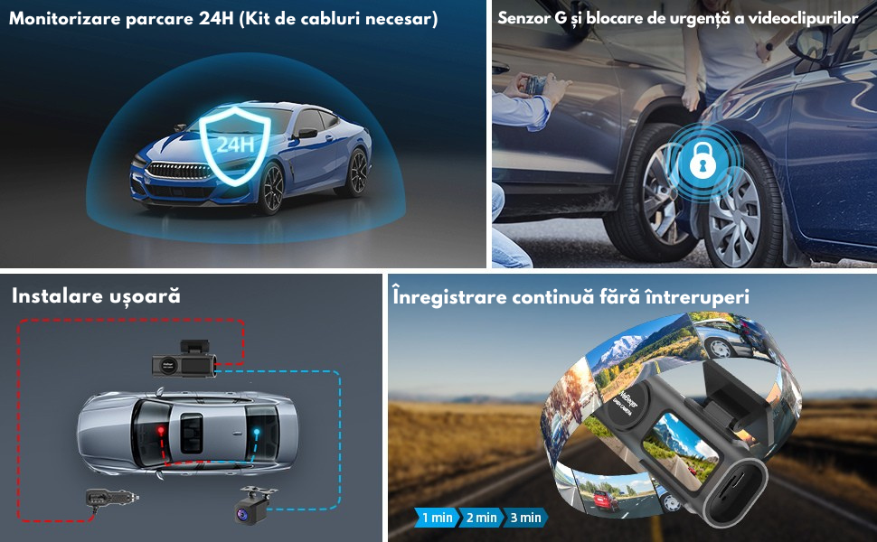 Monitorizare Parcare 24/7: Protejeaza-ti vehiculul chiar si cand este stationat. Modul Time-Lapse si senzorul G detecteaza si inregistreaza orice impact sau miscare neasteptata. ( Kit parcare nu este inclus ).