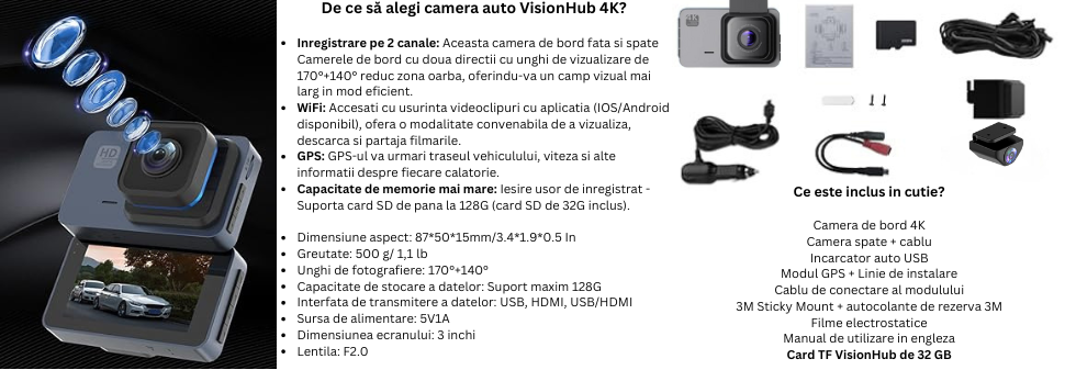Camera Auto Dubla de bord 4k - Full HD, VisionHub®, WIFI + GPS, G-Senzor Reglabil, Aplicatie pe Telefon, Night Vision, Loop Recording, Unghi Larg 170°, Ecran IPS De 3, 0 Inch, DVR cu Camera Fata 4k + Spate 1080p inclusa, Negru