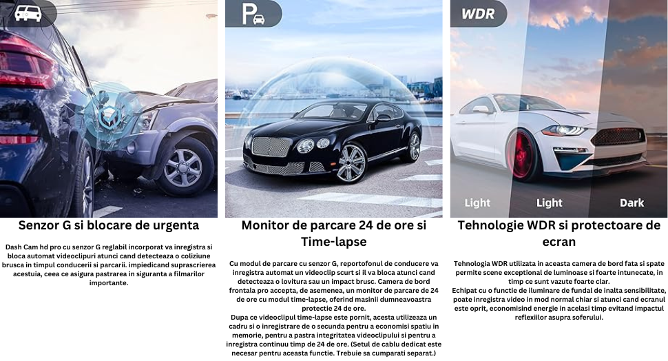 Noua actualizare a functiilor: Aceasta camera de bord pentru masini nu are doar functii precum mod de parcare 24 de ore, detectare miscare, obiectiv cu unghi larg de 170° A+, senzor G, inregistrare in bucla, blocare video de urgenta, inregistrare video in mod time-lapse etc. Dar, de asemenea, adauga avertizare pentru faruri, asistenta la mers inapoi, inregistrare automata a microfonului, inregistrare cu ecranul oprit etc. Functii puternice care iti protejeaza siguranta la volan.