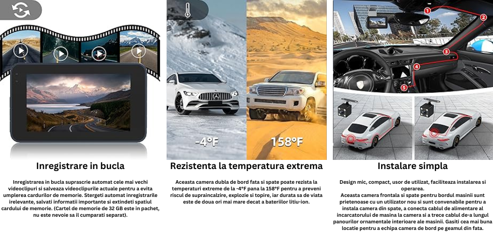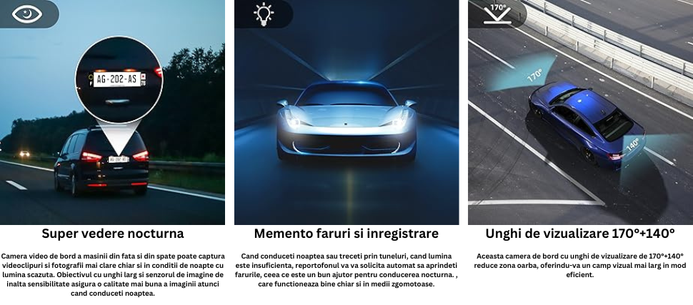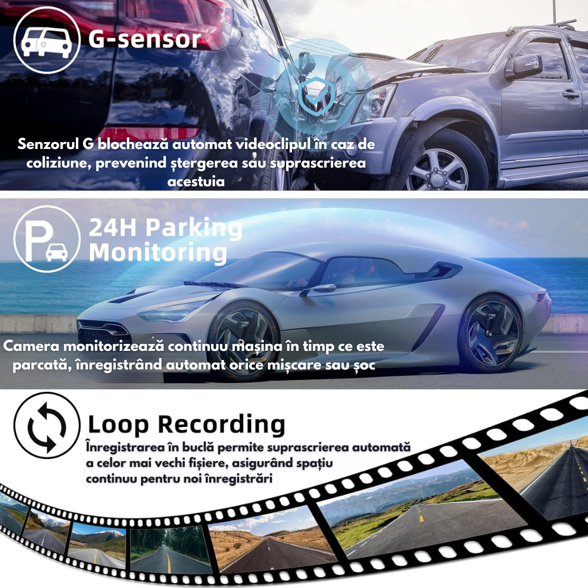 Camera de bord 4K poate inregistra videoclipuri la o rezolutie de pana la 1296p si te ajuta sa citesti detalii precum semnele de circulatie, numerele de inmatriculare ale vehiculelor etc. Camera de bord are camere DUAL atat frontale, cat si din spate, fiecare capturand la un unghi ultra-larg de 170° si, respectiv, 140°, pentru a reduce zona oarba, iar dovezile esentiale pot fi pastrate si prezentate in cazul unei coliziuni. Aceasta camera de bord suporta carduri micro SD de pana la 128 GB (inclus un card de memorie de 32 GB, nu este necesara achizitionarea separat)!