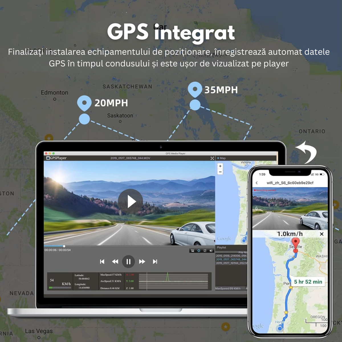Dashcam cu GPS: Aceasta camera de bord are GPS integrat, se conecteaza la modulul GPS si poate inregistra traseul de conducere, viteza in timp real, locatia etc. Folosind aplicatia sau GPSPlayer-ul nostru pentru Windows si Mac, vei putea obtine mai multe dovezi suplimentare daca se intampla un accident. Asigura-te ca instalezi modulul GPS inainte de utilizare.