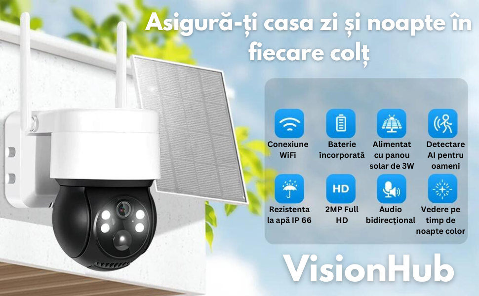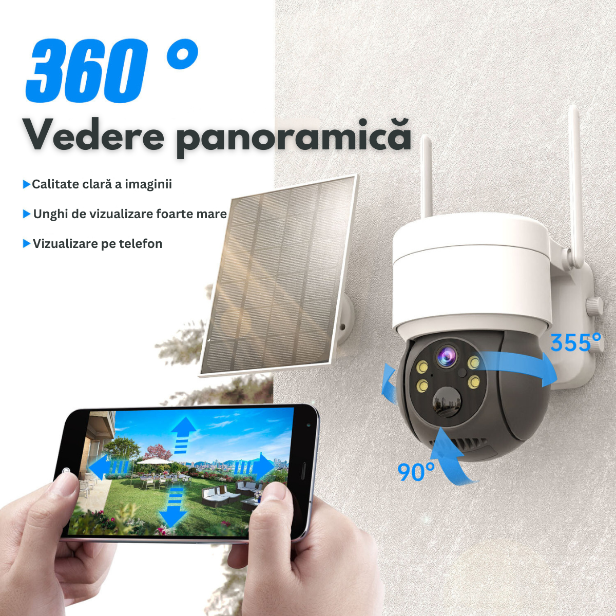 Camera Supraveghere Wireless Exterior cu Incarcare Solara, VisionHub®, Baterie Reincarcabila, Vizualizare 360°, Conectare Telefon, WIFI, 1080P FullHD, 2MP, Audio Bidirectional, alarma, Detectie Miscare PIR, Vizualizare Nocturna Color, Rezistenta la apa