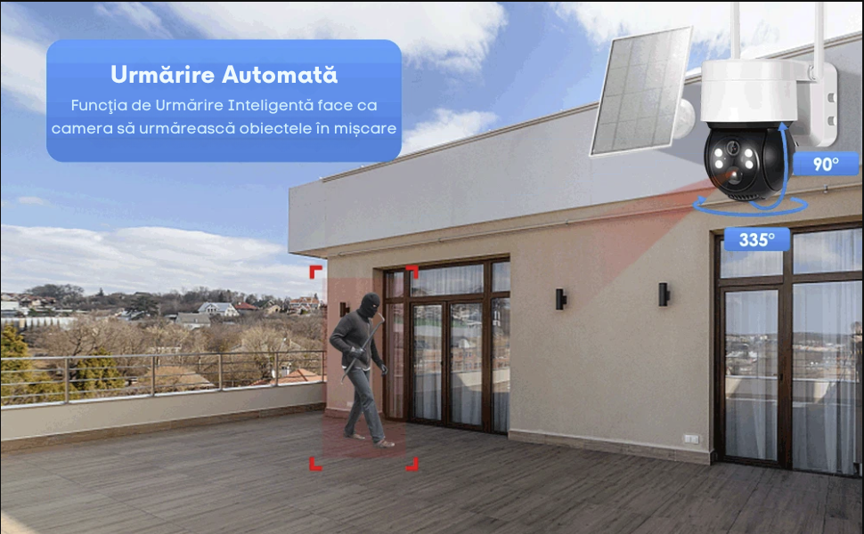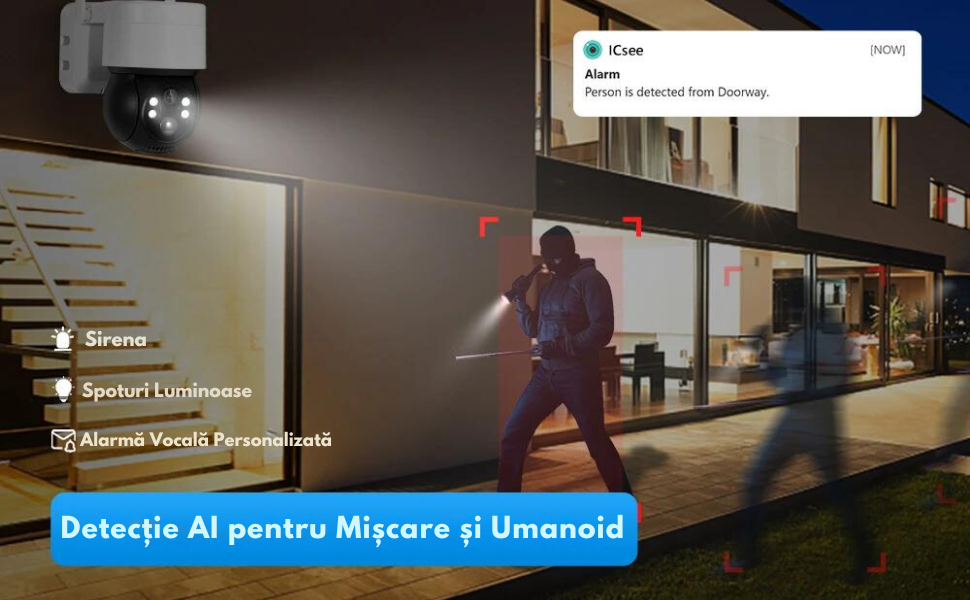 - Detectare Miscare PIR Inteligenta: Sistemul de detectie umanoida PIR trimite alerte in timp real pe telefonul mobil si reduce alarmele false, astfel incat sa fiti mereu informat despre activitatea suspecta din jurul casei dvs.
