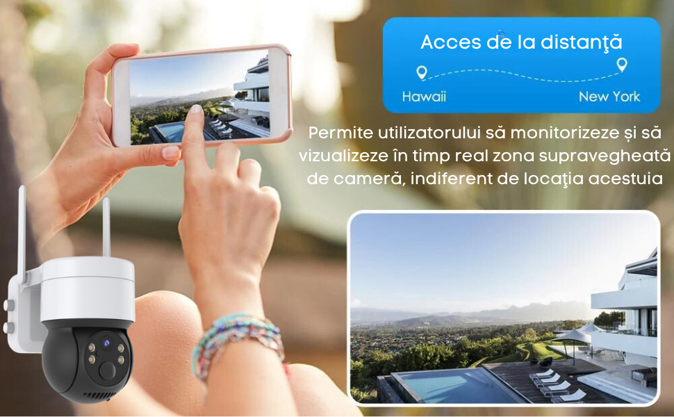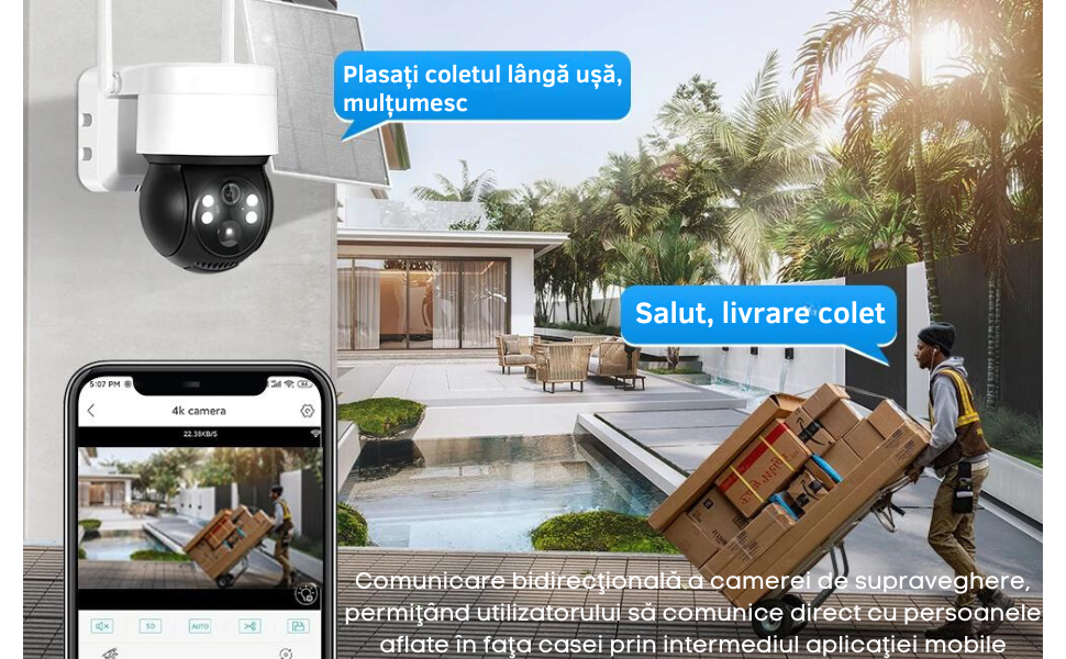 - Audio Bidirectional: Functia de interfon audio bidirectional permite comunicarea cu oricine se afla in jurul camerei prin intermediul aplicatiei mobile.