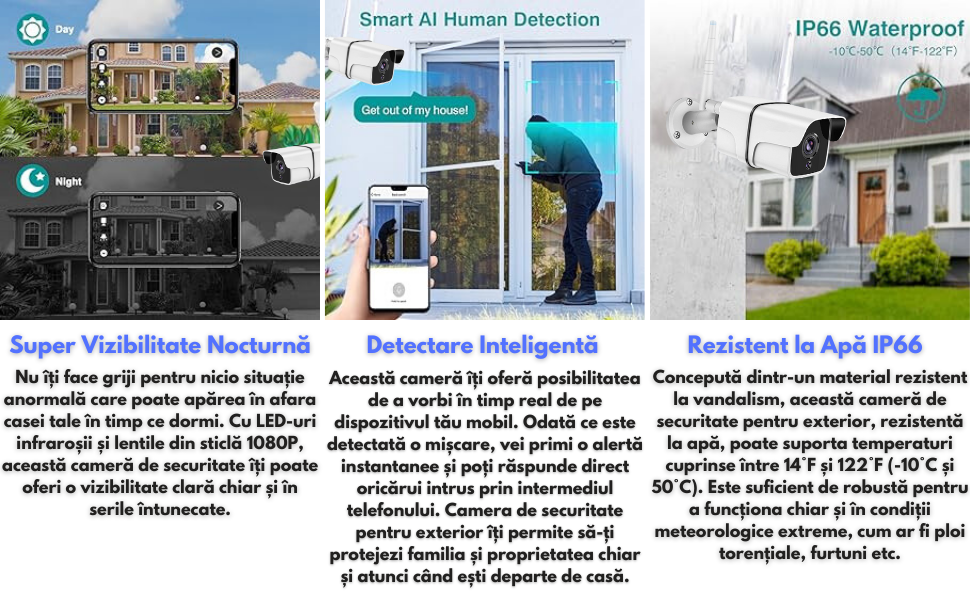 Protejeaza-ti casa zi si noapte cu camera de supraveghere wireless VisionHub, conceputa pentru securitatea exterioara. Aceasta camera ofera o rezolutie Full HD 1080P, asigurand imagini clare si detaliate, chiar si in conditii de lumina scazuta, datorita functiei de vizibilitate nocturna cu LED-uri infrarosii. Este perfecta pentru monitorizarea curtilor, gradinilor sau intrarilor, indiferent de conditiile meteorologice, datorita rezistentei la apa IP66 si a carcasei robuste din materiale anti-vandalism.