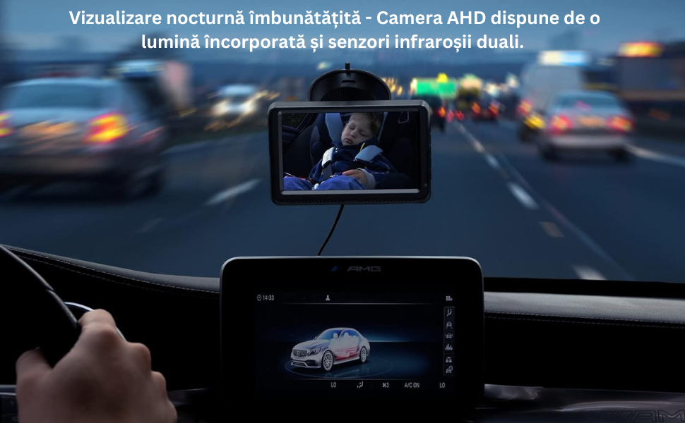 Camera AHD recent actualizată este echipată cu o lumină incorporată și senzori infraroșii duali. Această caracteristică asigură o vizibilitate clară in orice condiții de iluminare redusă sau in timpul deplasărilor de seară, permițandu-vă să observati bebelușul in scaunul din spate al mașinii.