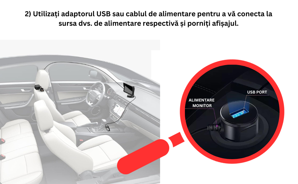 Procesul de instalare este simplu și rapid. Fixați suportul camerei pe una dintre barele tetiere ale mașinii și reglați unghiul camerei pentru a obține vizualizarea optimă. Utilizați adaptorul USB sau cablul de alimentare pentru a vă conecta la sursa dvs. de alimentare preferată și porniți afișajul. In doar cațiva pași, veți beneficia de toate funcționalitățile.