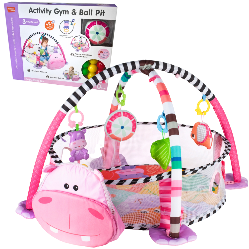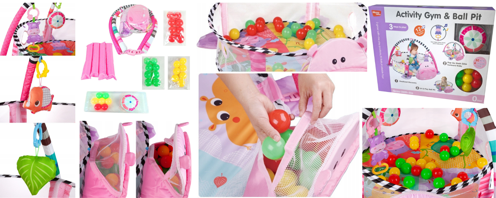 Salteluta de activitati bebe cu bile 3 in 1 are patru jucarii mari detasabile care atarna si 30 de bilute pentru a stimula curiozitatea si dezvoltarea copilului.