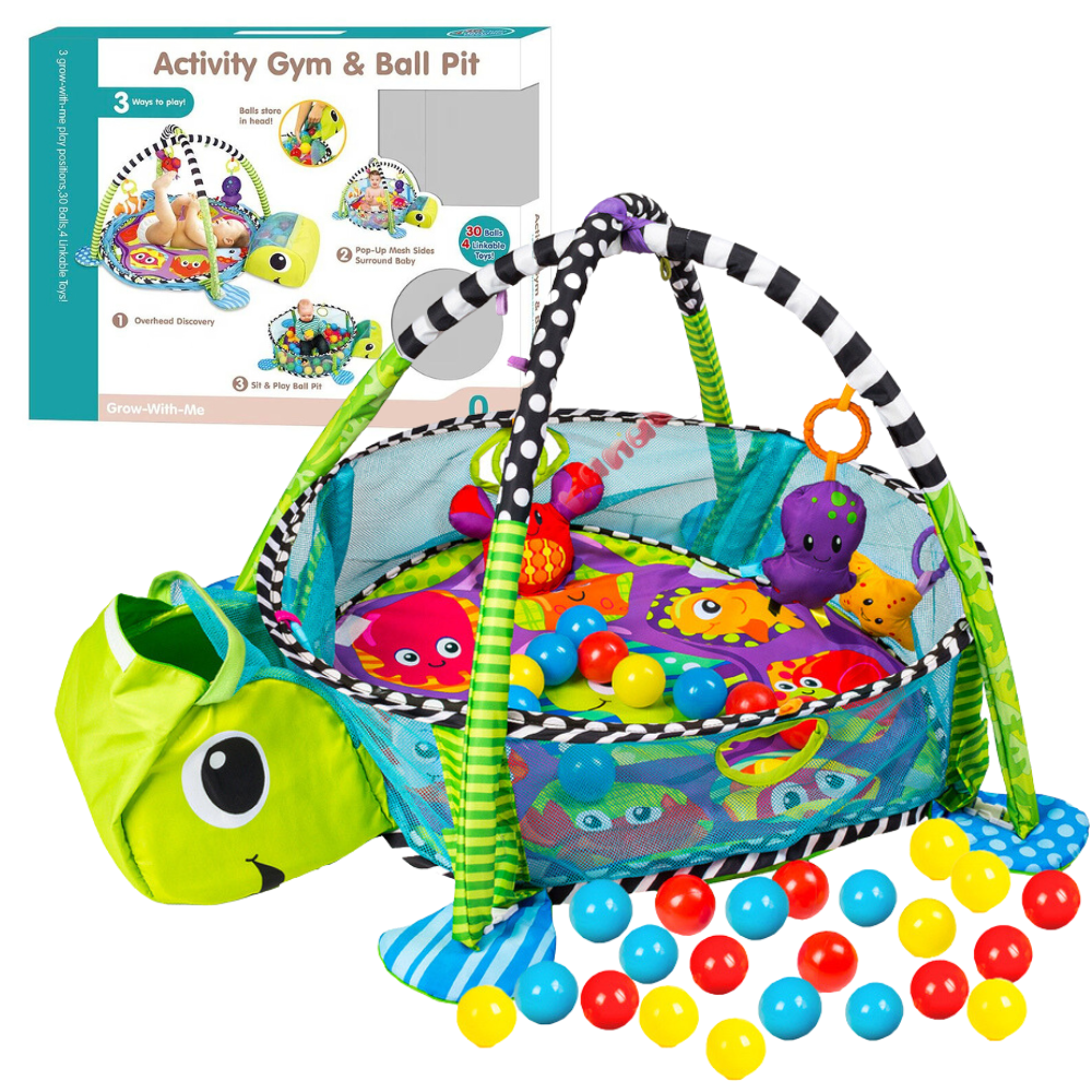 Salteluta de activitati bebe cu bile 3 in 1 are patru jucarii mari detasabile care atarna si 30 de bilute pentru a stimula curiozitatea si dezvoltarea copilului.