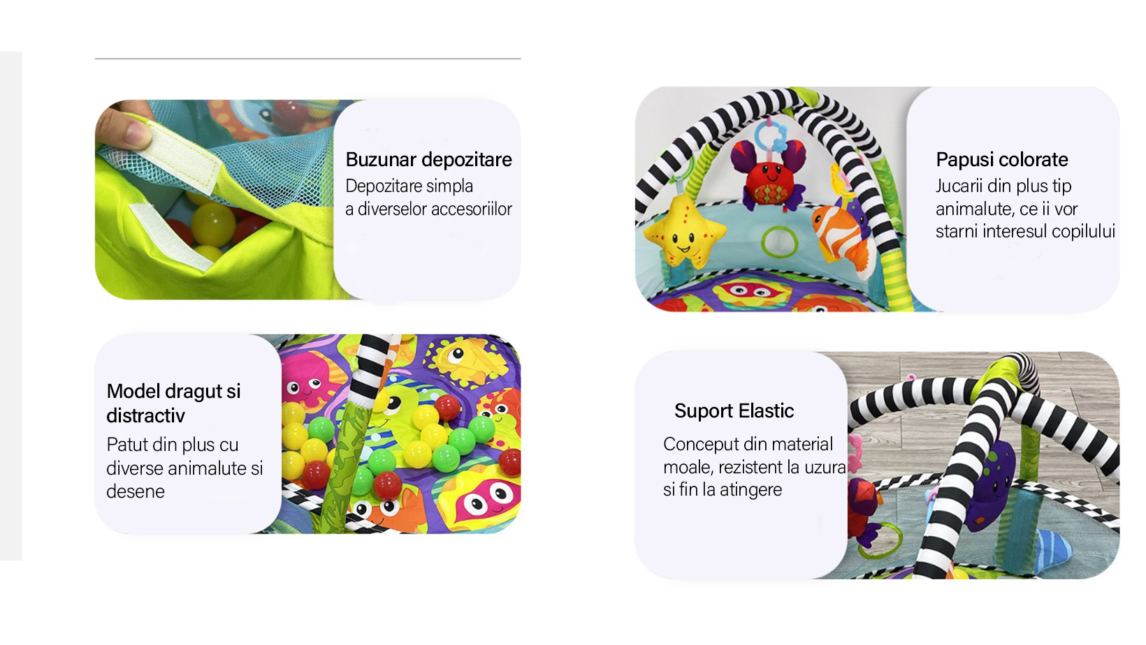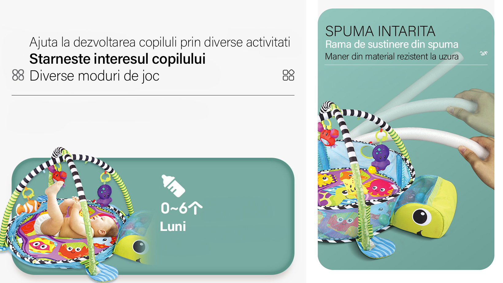 Centru de activitati cu arcada pentru bebelusi si copii, salteluta de activitati se transforma intr-un tarc de joaca unde bebe se poate juca in siguranta in perioada in care incepe sa se ridice in sezut, se va intinde dupa jucarioare, ii puteti oferi si bilele colorate pentru distractie maxima.