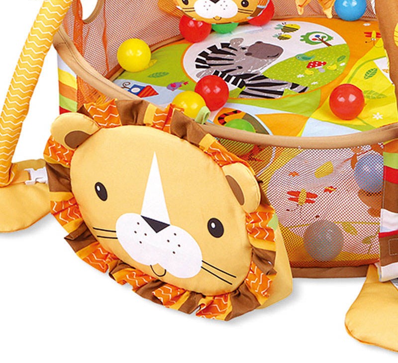 Centru de activitati multifunctional interactiv pentru copii si bebelusi, VisionHub®, 3 in 1 tip tarc, cu Bile moi multicolore si Jucarii interactive, tip Leu, 0 luni +