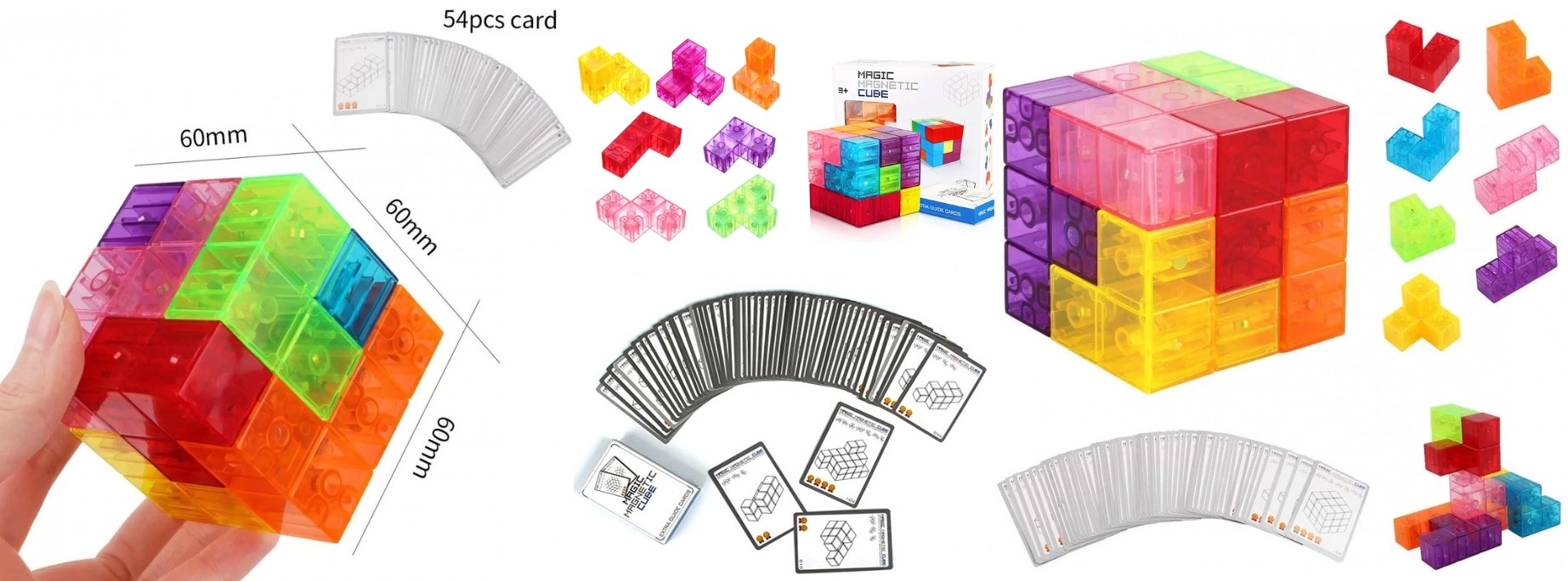 - Fiecare bloc este magnetic, astfel incat cubul este strans conectat dupa ce a fost asamblat. Posibilitatea de asamblare formand sute de modele geometrice._