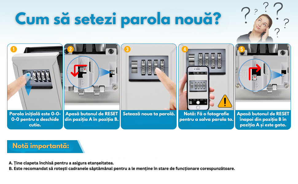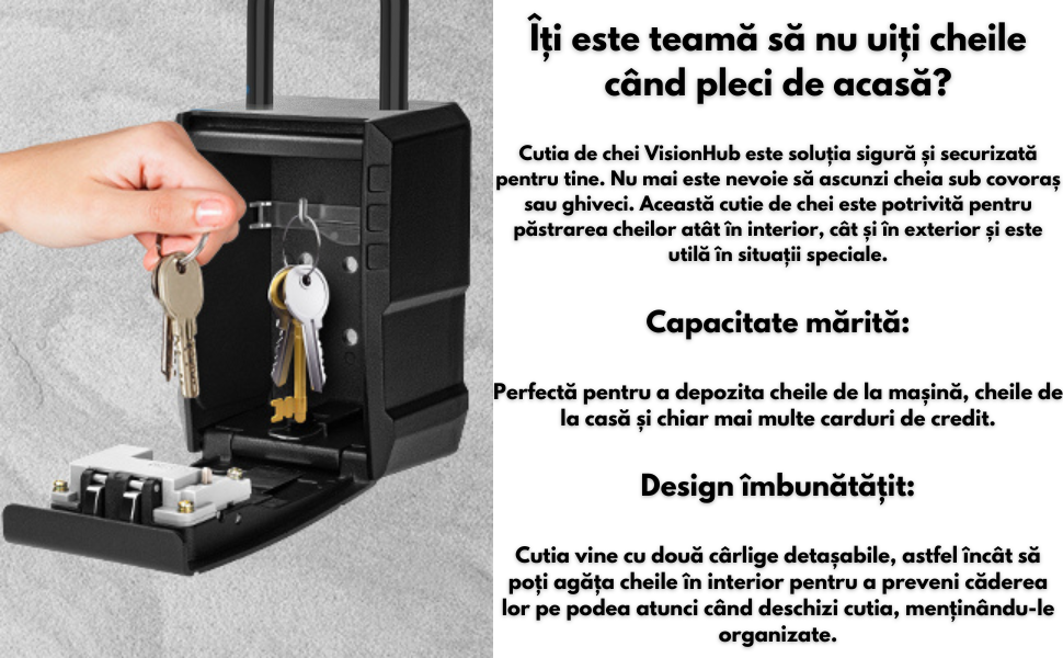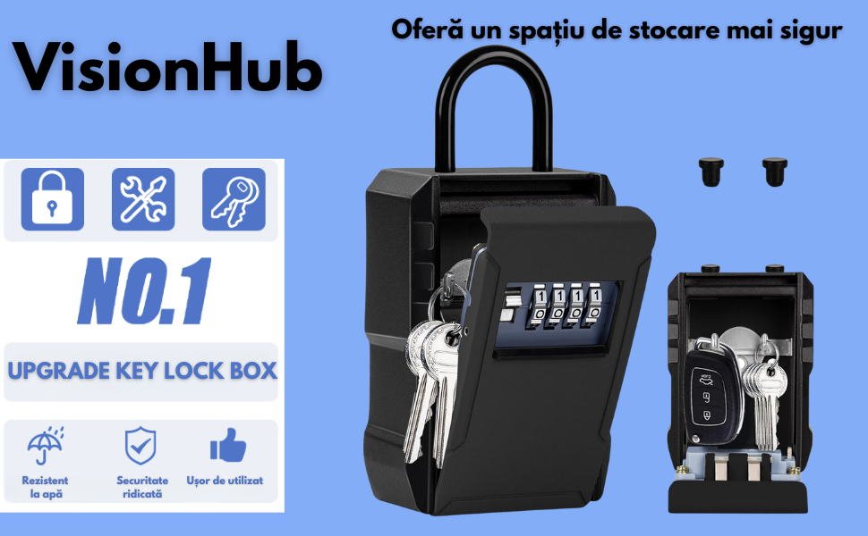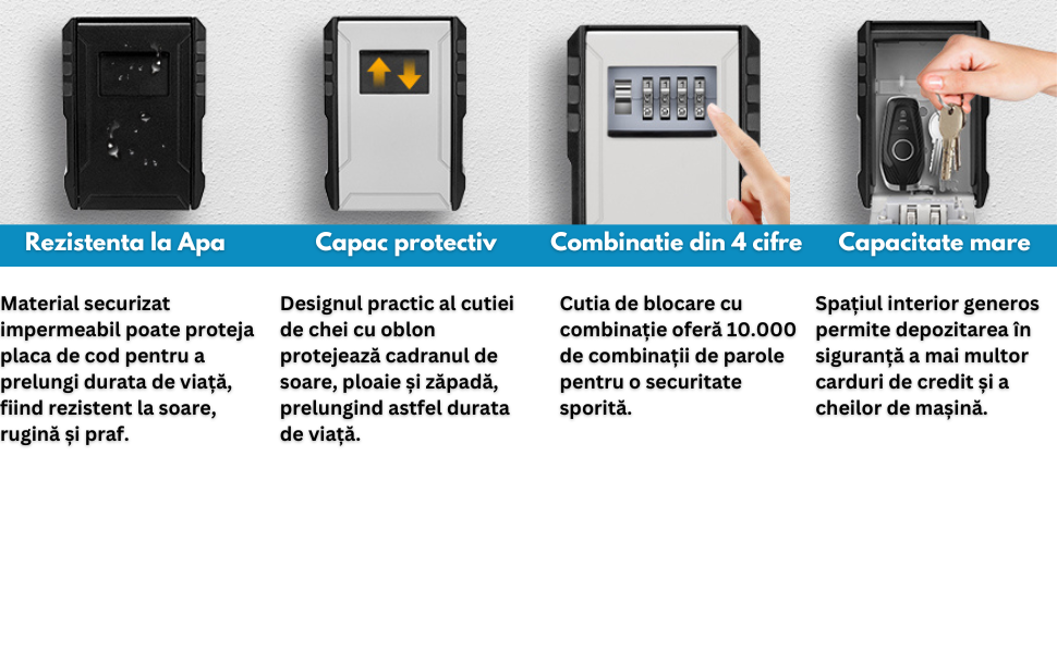 - Durabila si robusta: Cutia de blocare a cheilor este fabricata din aliaj de zinc de inalta calitate, rezistenta la apa, la rugina, la taiere si la deteriorari violente. Venit cu scut glisant care protejeaza cadranele digitale de soare, ploaie, praf si zapada.