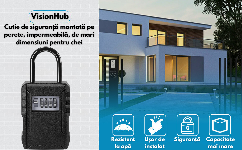 Cutie metalica cu cifru pentru depozitare chei, Tip Lacat, VisionHub®, Rezistenta la apa, Caseta exterioara impermeabila, rezistenta, de capacitate foarte mare, aliaj de aluminiu, Montare pe perete, Regim Hotelier, Booking, AirBnb, Acasa, Negru