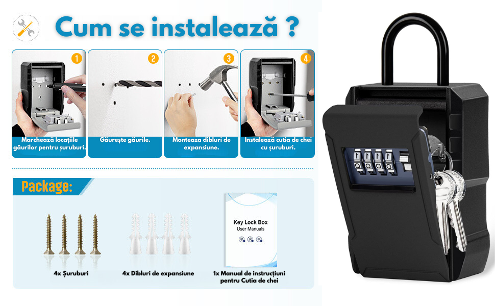 - Usor de utilizat: combinatia de cutie de blocare pentru depozitarea cheilor poate fi resetata in 4 pasi simpli. Vin cu 4 suruburi si 4 dopuri de expansiune din nailon, si un set de suruburi cu ochi de pisica, puteti instala cutia de blocare a cheii oriunde doriti.