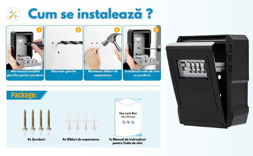- Usor de utilizat: combinatia de cutie de blocare pentru depozitarea cheilor poate fi resetata in 4 pasi simpli. Vin cu 4 suruburi si 4 dopuri de expansiune din nailon, si un set de suruburi cu ochi de pisica, puteti instala cutia de blocare a cheii oriunde doriti.