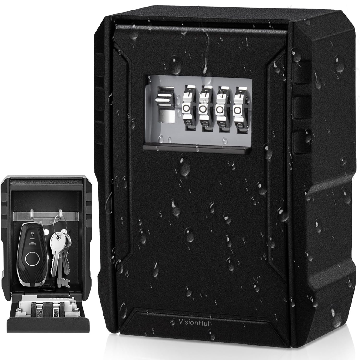 Cutie metalica cu cifru pentru depozitare chei VisionHub®, Caseta exterioara impermeabila, rezistenta, de capacitate foarte mare, aliaj de aluminiu, cu suport de agatare, Neagra