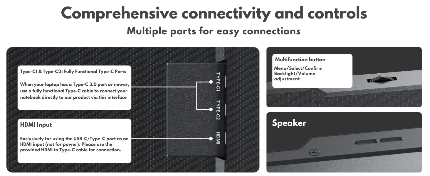 - Customizable and Easy to Use: The Laptomo portable laptop monitor features a quick plug-and-play design, requiring only one fully functional Type-C port. For compatibility, your laptop should have either two USB-C ports (full function) or one USB-C and one HDMI port. If your laptop doesn’t have a Type-C port with DisplayPort, an adapter may be required.