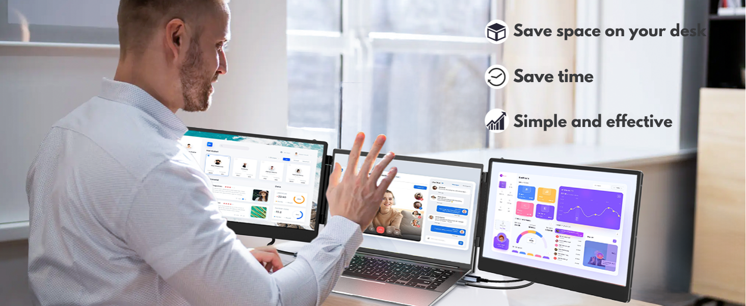 This innovative portable monitor gives you the ability to triple your work efficiency, offering a complete solution for multitasking, gaming, streaming, and productivity. With a modern design, easy portability, and extended compatibility, it’s the perfect choice for professionals, gamers, students, and anyone who needs more screen space.