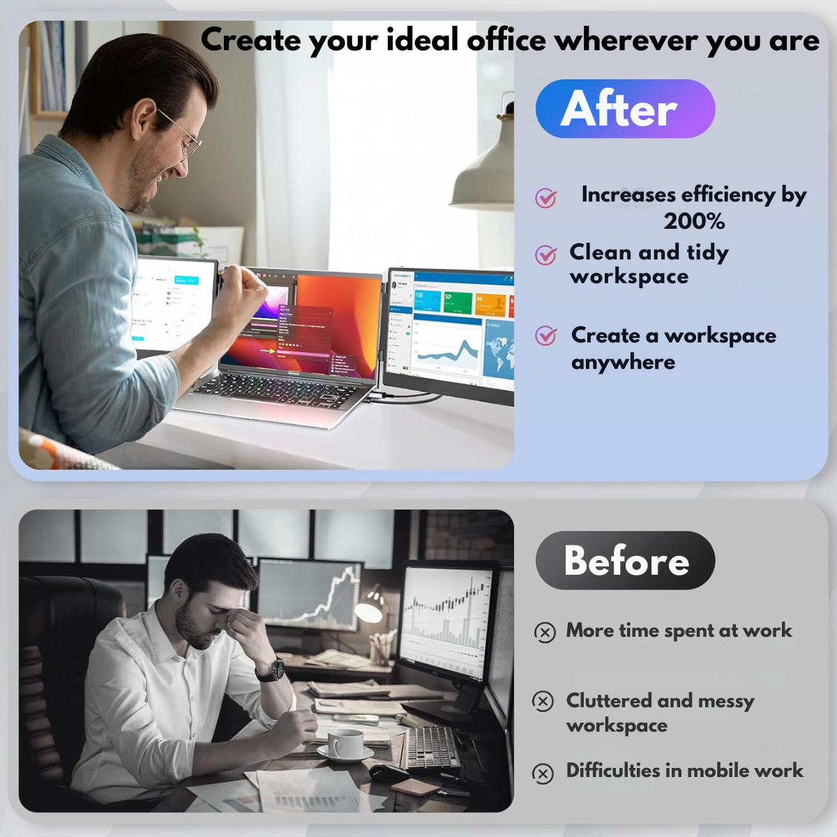 - Portable with High Performance: This external monitor combines robust functionality with a lightweight design, ideal for on-the-go use. Boost your productivity by up to 300% without needing additional accessories. Enjoy stable screens, supported by a flexible stand, all conveniently packed in the included carrying case.