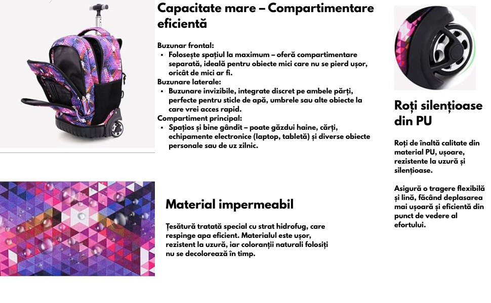 Acest rucsac pe roti ajuta la reducerea incarcaturii elevilor si contribuie la cresterea sanatoasa a copiilor. Ofera o experienta diferita, relaxanta si placuta in drumul catre scoala.