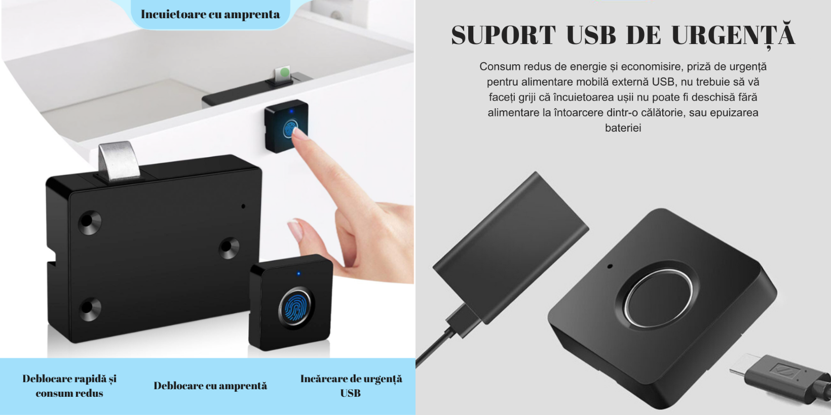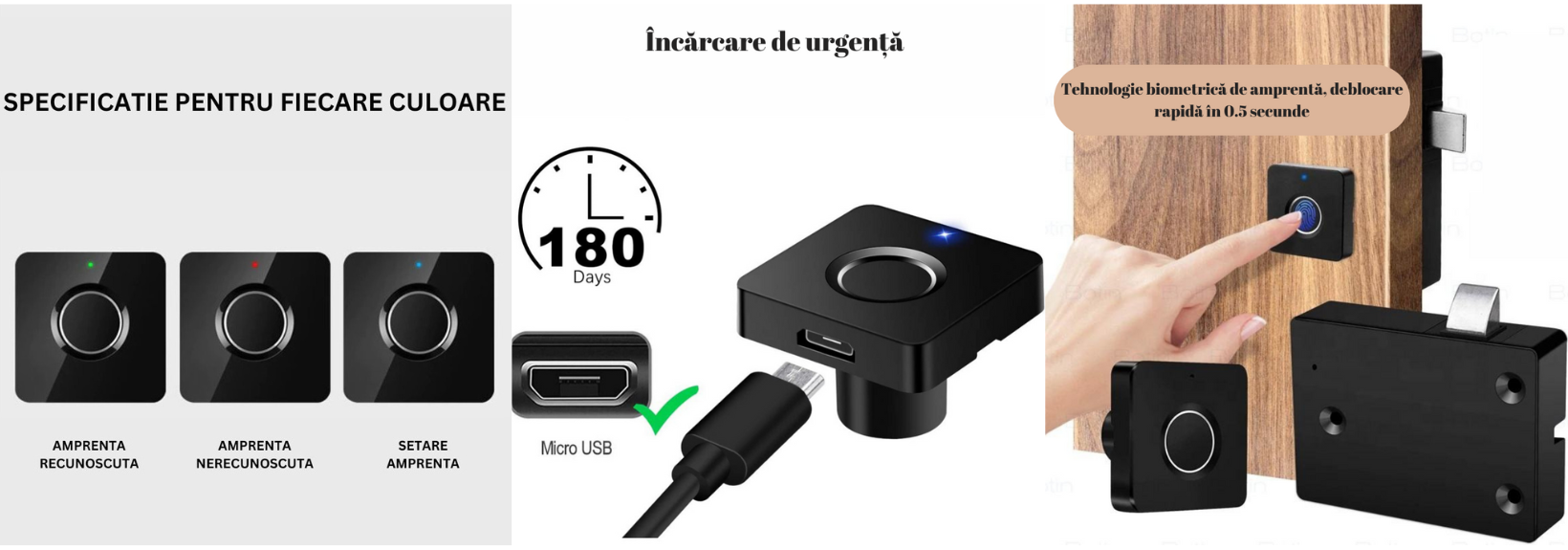 - Pe cititorul de amprente aveti mufa USB pentru a putea incarca si descuia in cazul in care bateriile se descarca complet.
