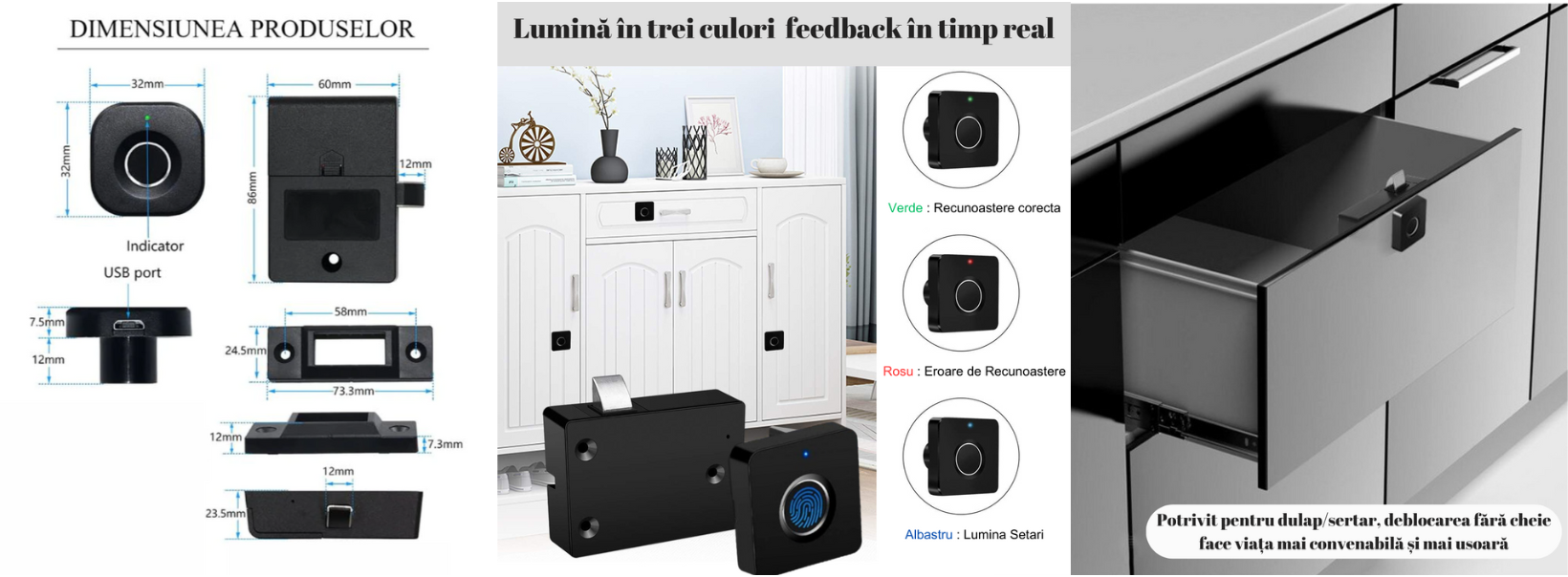 Design modern. Portul de incarcare de urgenta USB este proiectat pe panoul cu amprenta, astfel incat sa poata fi incarcat urgent pentru a evita situatia ca incuietoarea electronica sa fie epuizata si blocata permanent. In plus, zona de recunoastere a amprentei este echipata cu o lumina in trei culori pentru a oferi feedback in timp real asupra starii blocarii cu amprenta a sertarului.