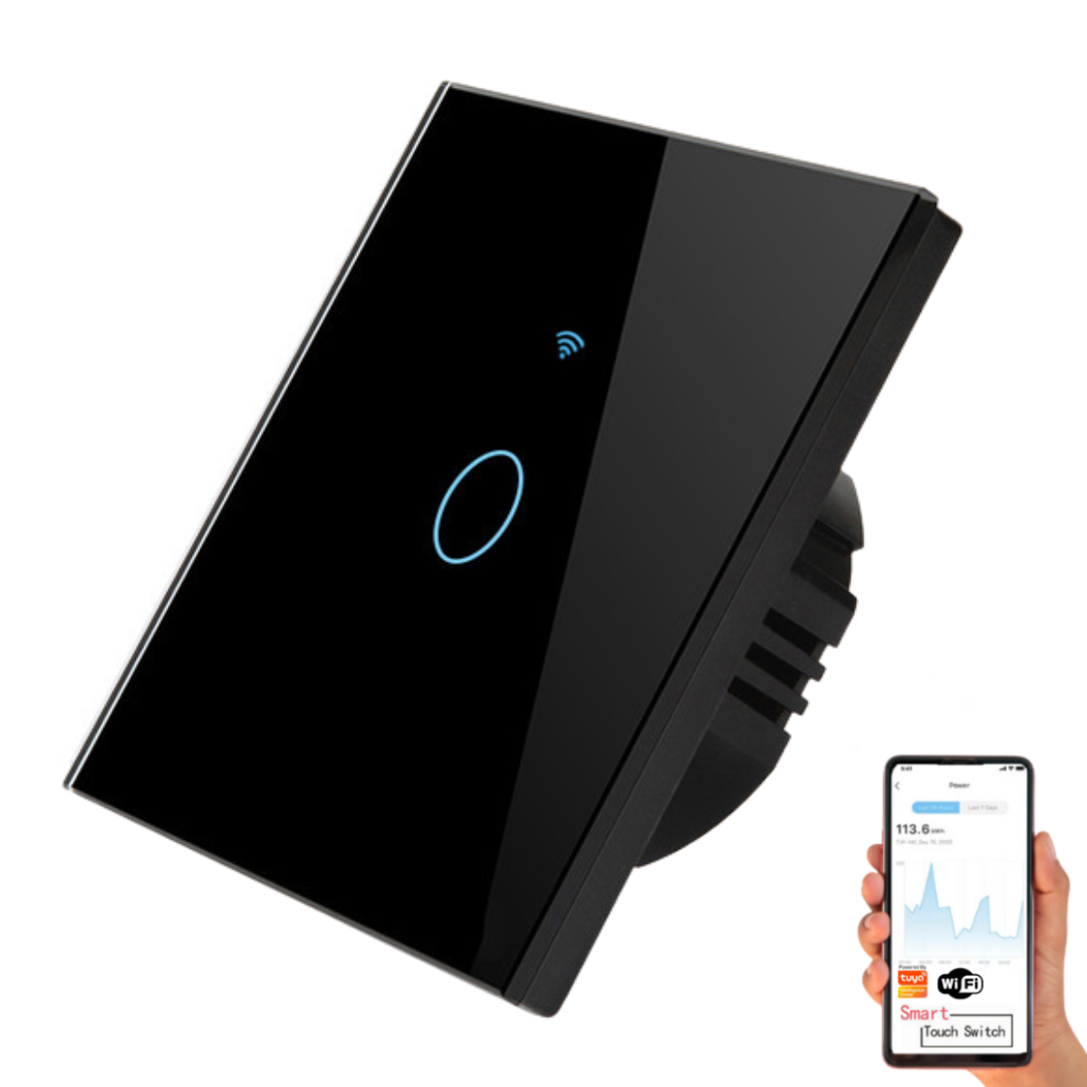 Intrerupator inteligent cu touch, Wireless, VisionHub®, Wi-fi, 1 Canal, din Sticla Securizata, Compatibil iOS/Android, Tuya, Amazon Alexa/Google Assistant, rezistent la zgarieturi, ideal pentru birou, camera de zi, dormitor, baie si bucatarie, Negru