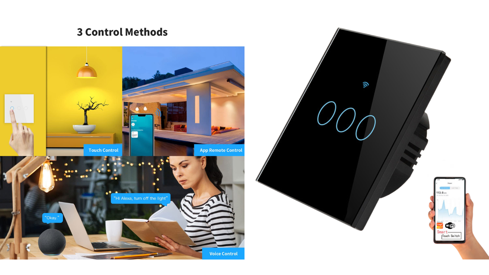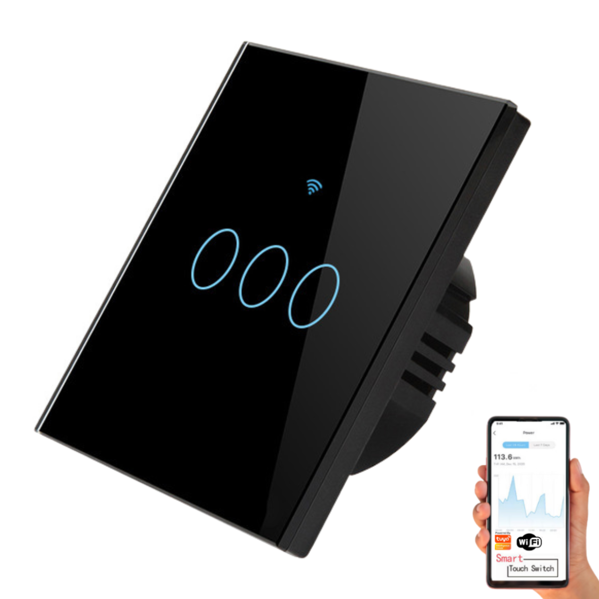 Intrerupator inteligent cu touch, Wireless, VisionHub®, Wi-fi, 3 Canale, din Sticla Securizata, Compatibil iOS/Android, Tuya, Amazon Alexa/Google Assistant, rezistent la zgarieturi, ideal pentru birou, camera de zi, dormitor, baie si bucatarie, Negru