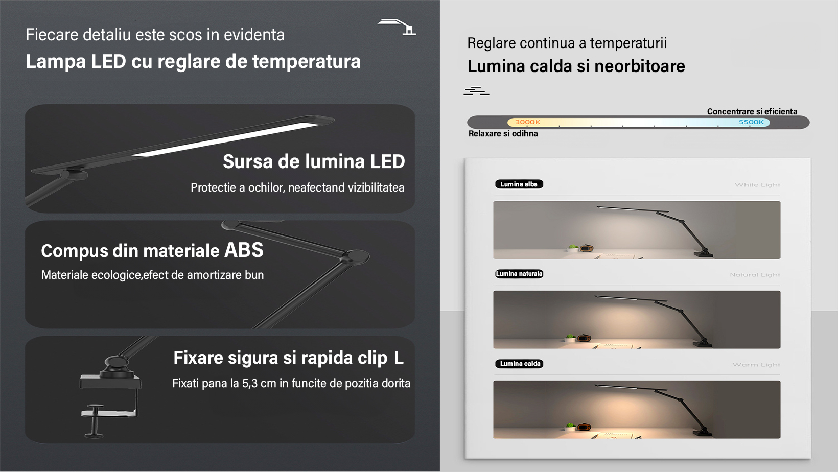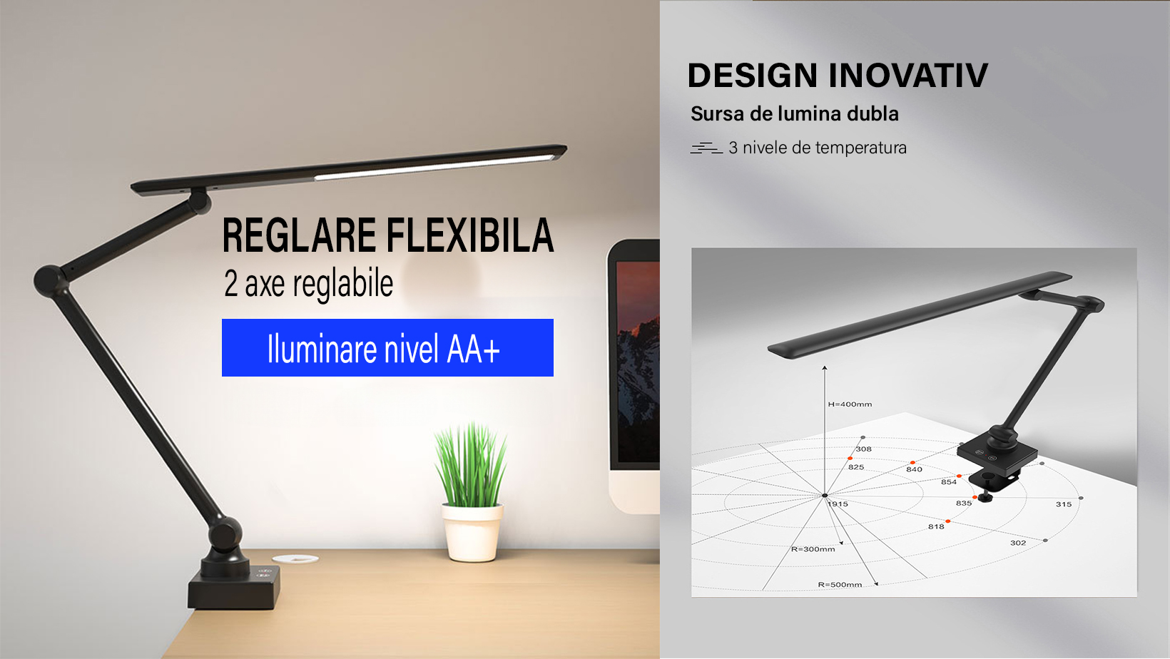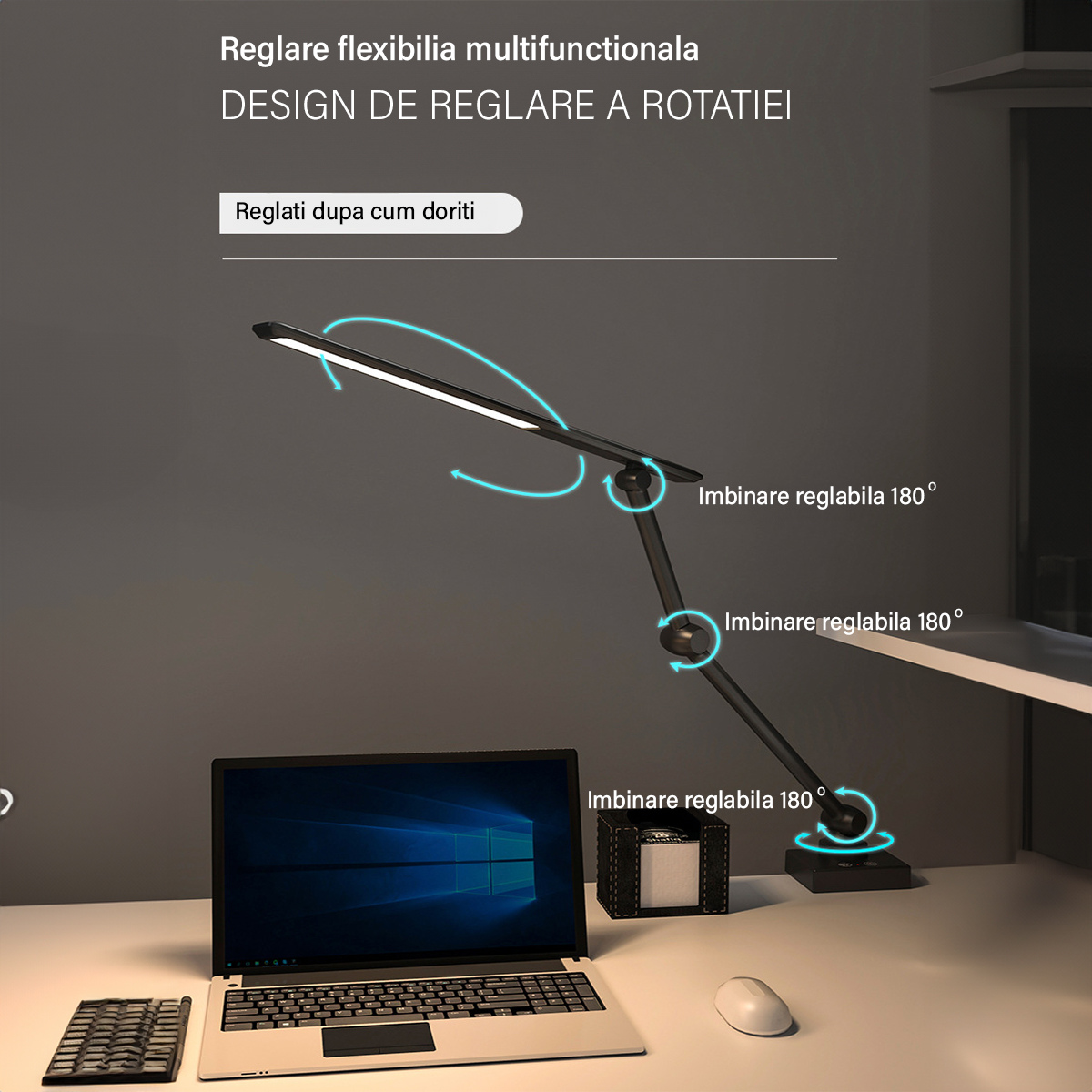 - Durabilitate si Economie: Construita din materiale de inalta calitate, lampa LED de birou este conceputa sa dureze si sa ofere economii semnificative pe termen lung, eliminand costurile si inconvenientele asociate cu inlocuirea frecventa a becurilor.