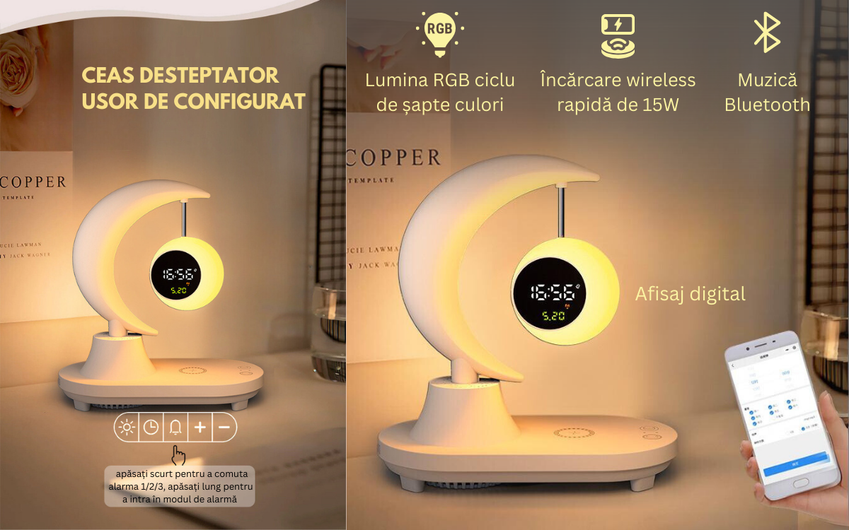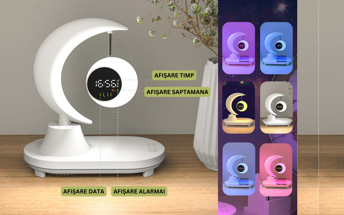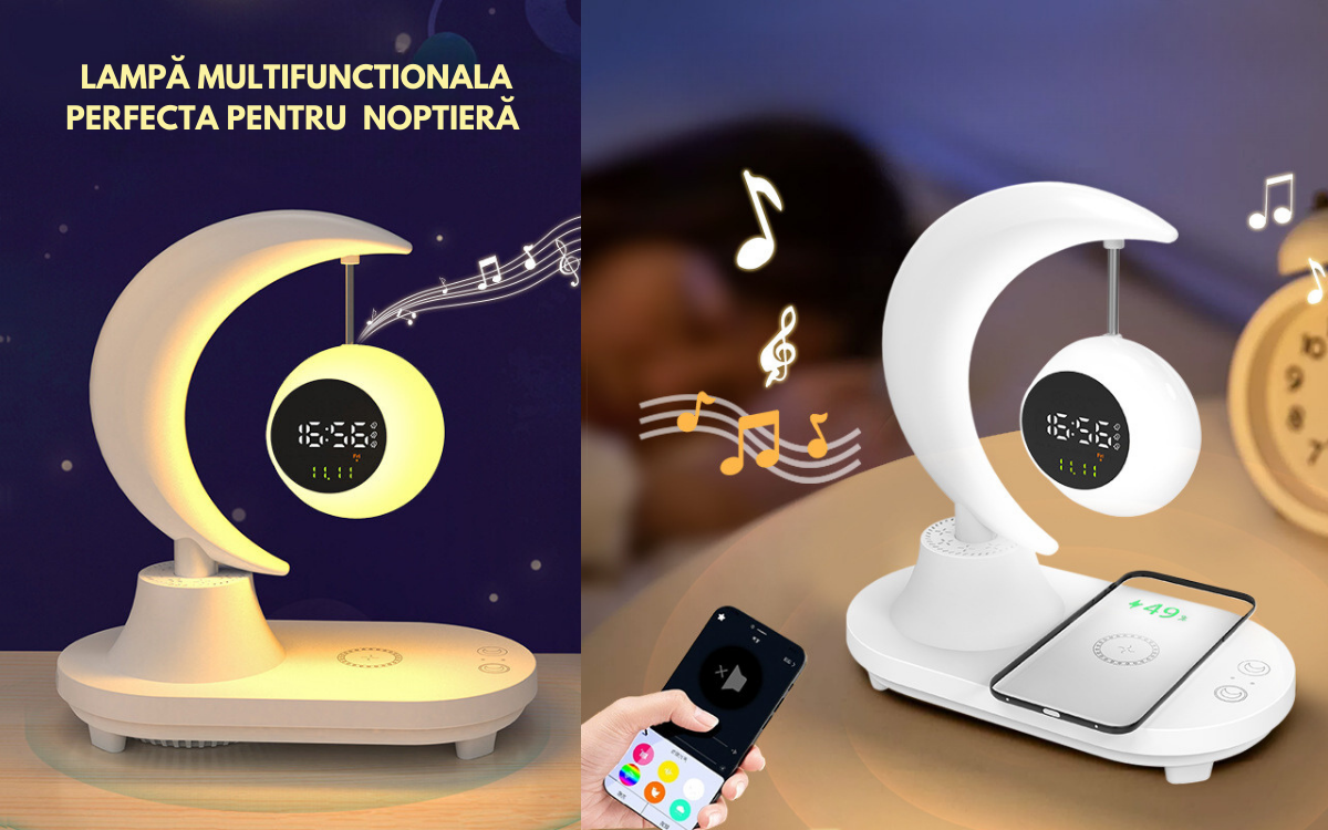 Această lampă smart nu este doar un dispozitiv de iluminare – este o simfonie de lumină și sunet. Cu un afișaj pentru ora și funcție de alarmă, devine un companion indispensabil in organizarea zilnică.