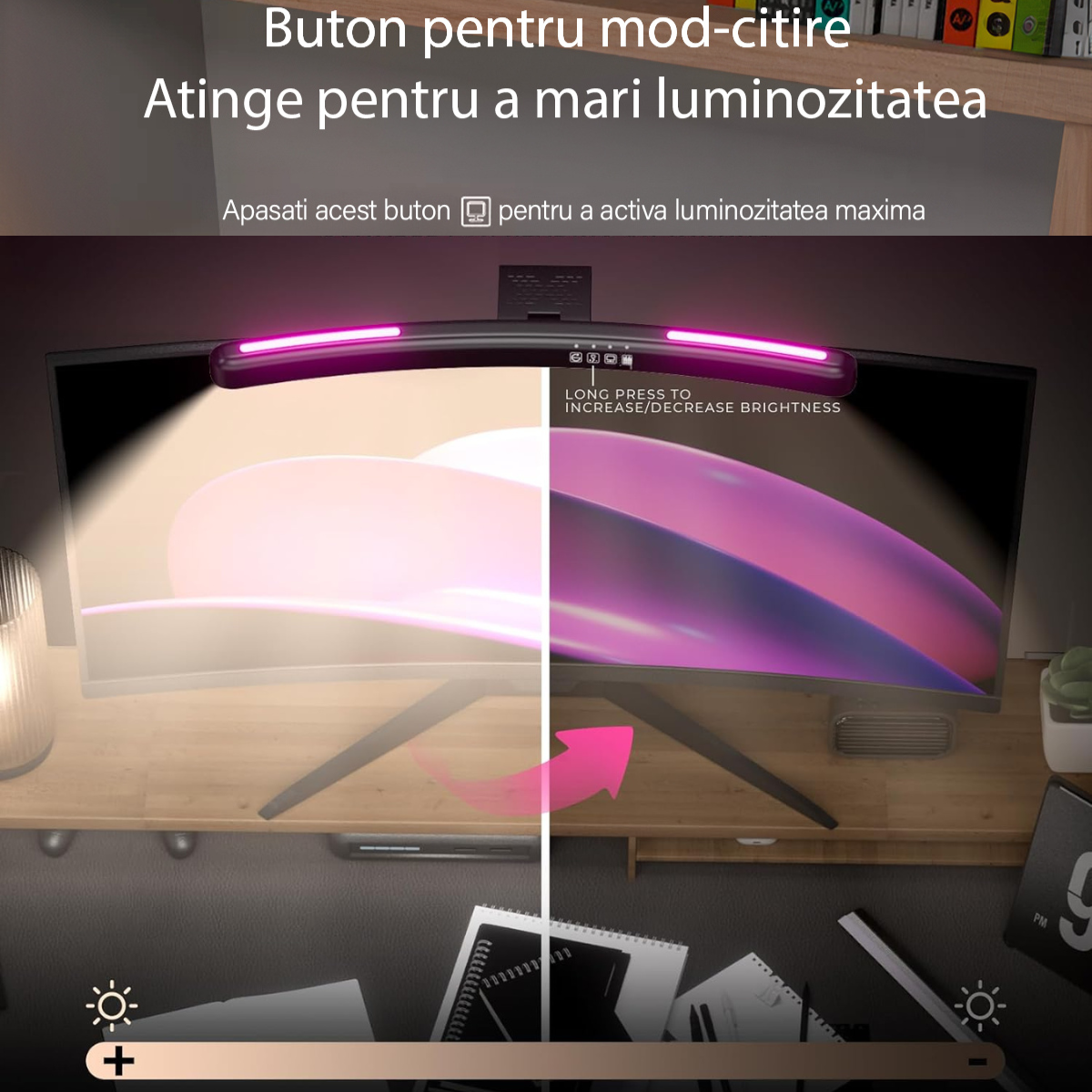 Da viata experientei tale de gaming sau de lucru la monitor cu ajutorul Lampii LED pentru Monitor Curbat, RGB Gaming Backlight VisionHub®. Aceasta lampa inteligenta si eleganta transforma spatiul de lucru intr-un mediu optimizat, aducand o lumina personalizabila si vibranta. Cu o serie de caracteristici de varf si tehnologie de protectie a ochilor, aceasta lampa este alegerea ideala pentru pasionatii de gaming si profesionistii care petrec mult timp in fata monitorului.