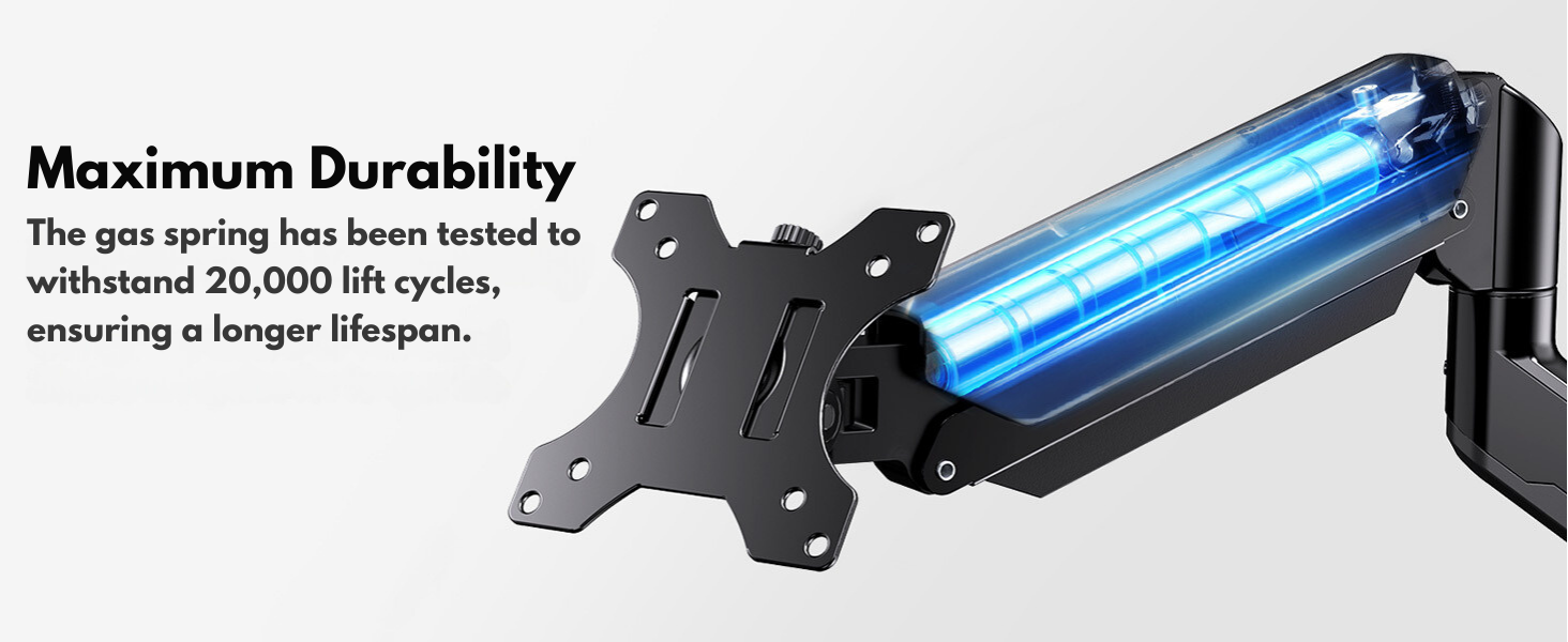 ✅ Gas Spring Adjustment System: The articulating arm allows smooth and precise adjustments for height, tilt, and monitor position. Tested for 20,000 lift cycles, ensuring maximum durability and effortless operation.