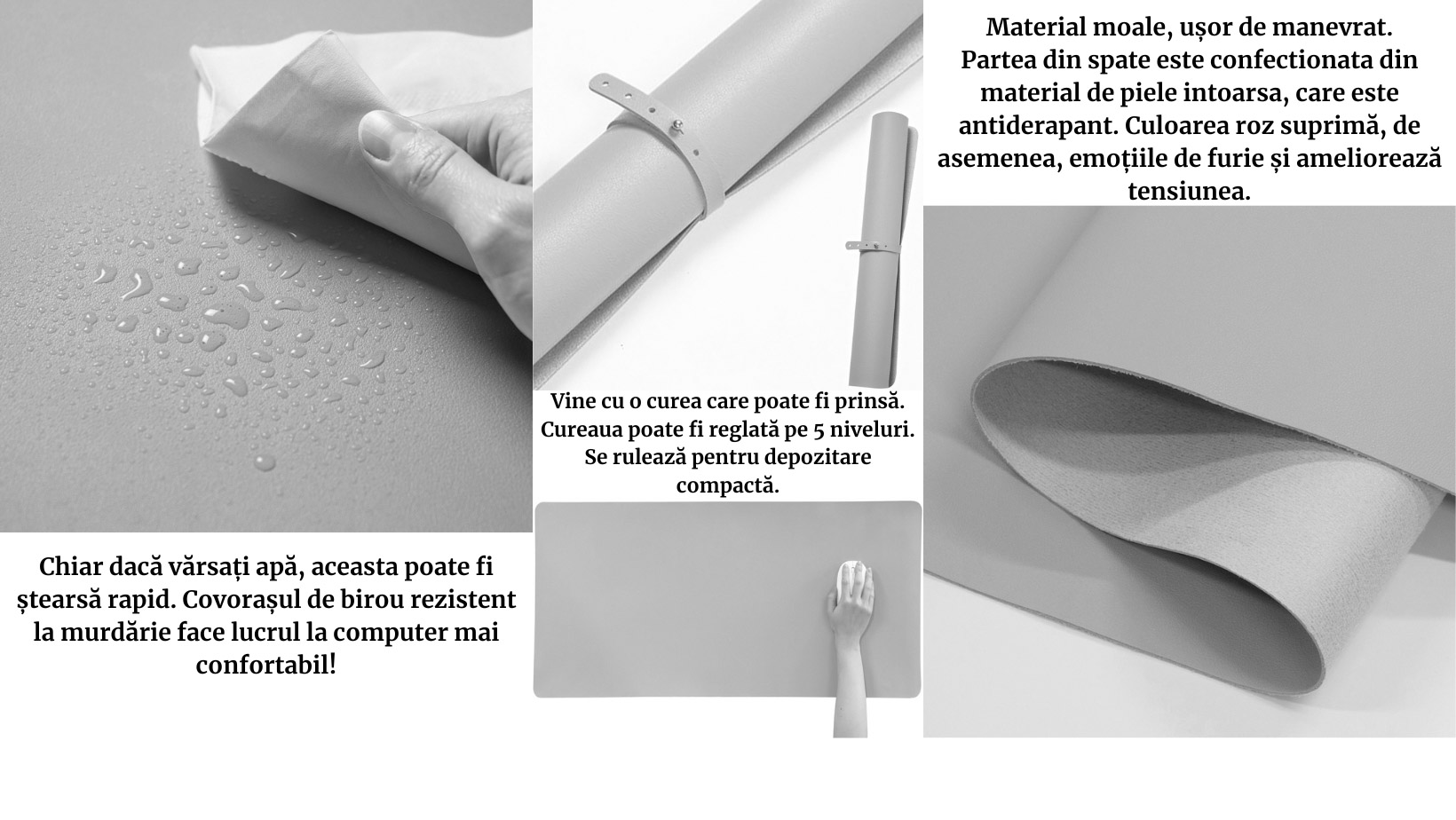 Cu dimensiuni generoase, mousepad-ul acoperă și protejează suprafața biroului, oferind suficient spațiu pentru mouse, tastatură, monitor sau laptop. Este impermeabil și ușor de intreținut, iar materialul rezistent la apă protejează zona de eventualele lichide vărsate accidental, putand fi curățat ușor cu o lavetă umedă. De asemenea, mousepad-ul este flexibil și poate fi rulat, vine cu o bandă de prindere și este ușor și portabil.