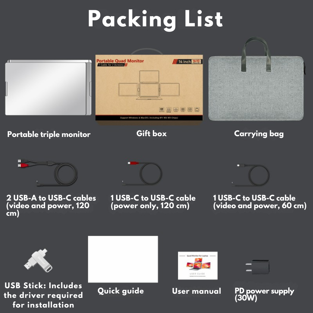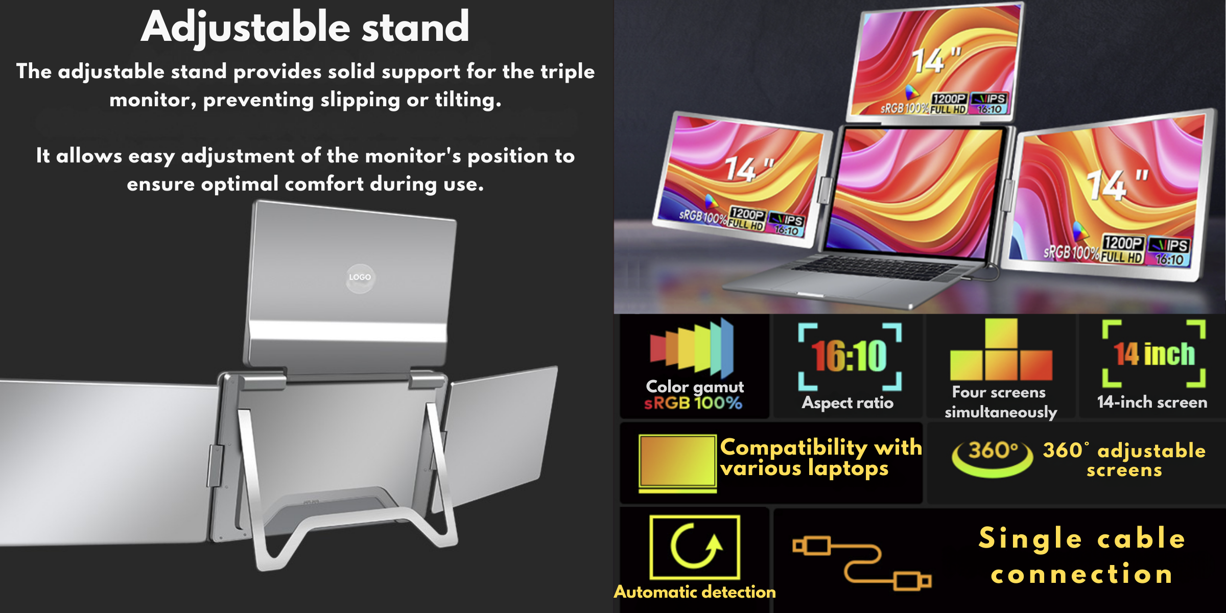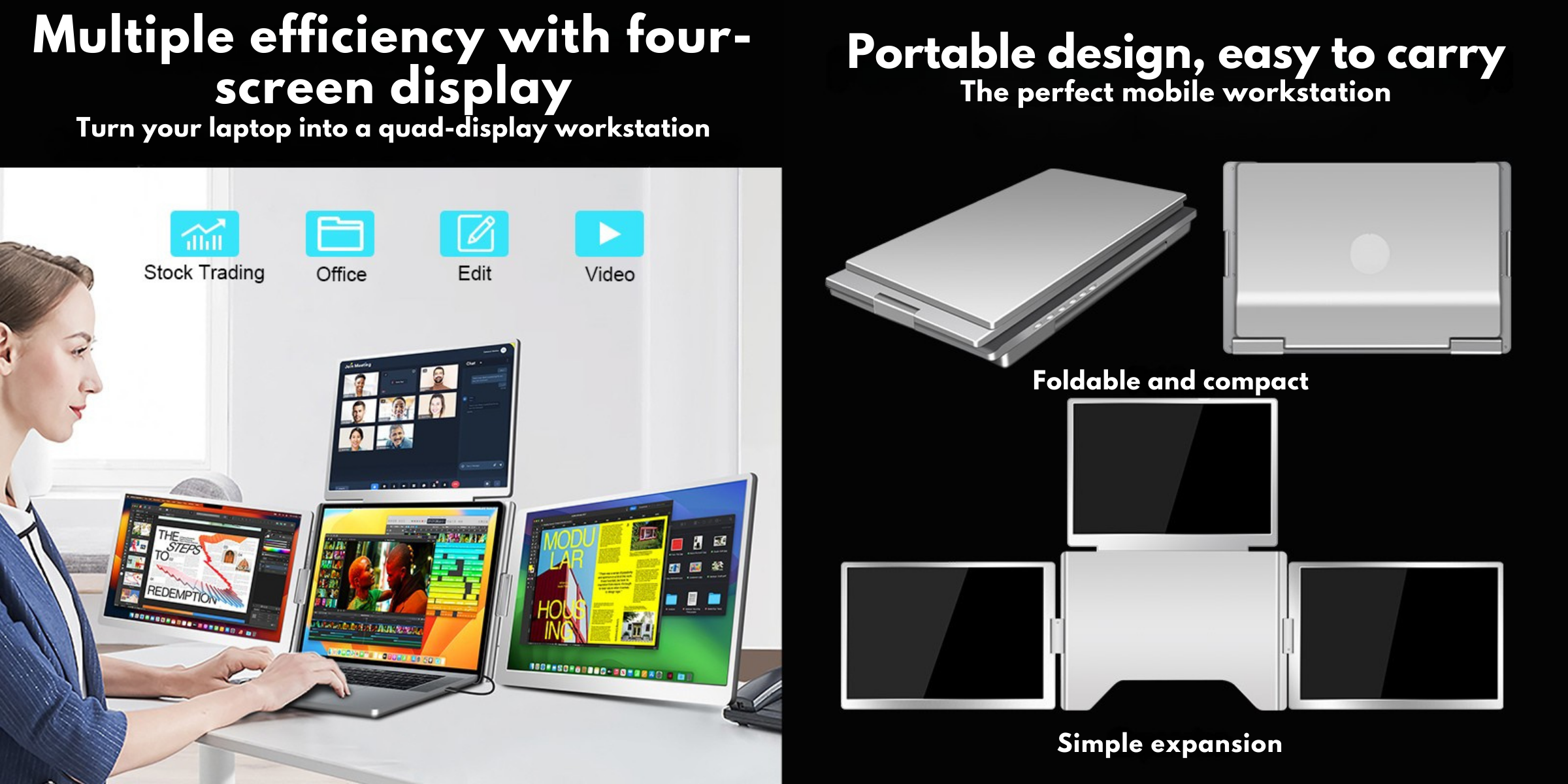 Quad-Screen Expandable and Portable for Laptop, 3 x 14" Full HD 1200P Screens, 100% sRGB, Foldable and Rotatable 360°, Compatible with 13"-17.3" Laptops, Windows and macOS, Complete Workstation for Multitasking