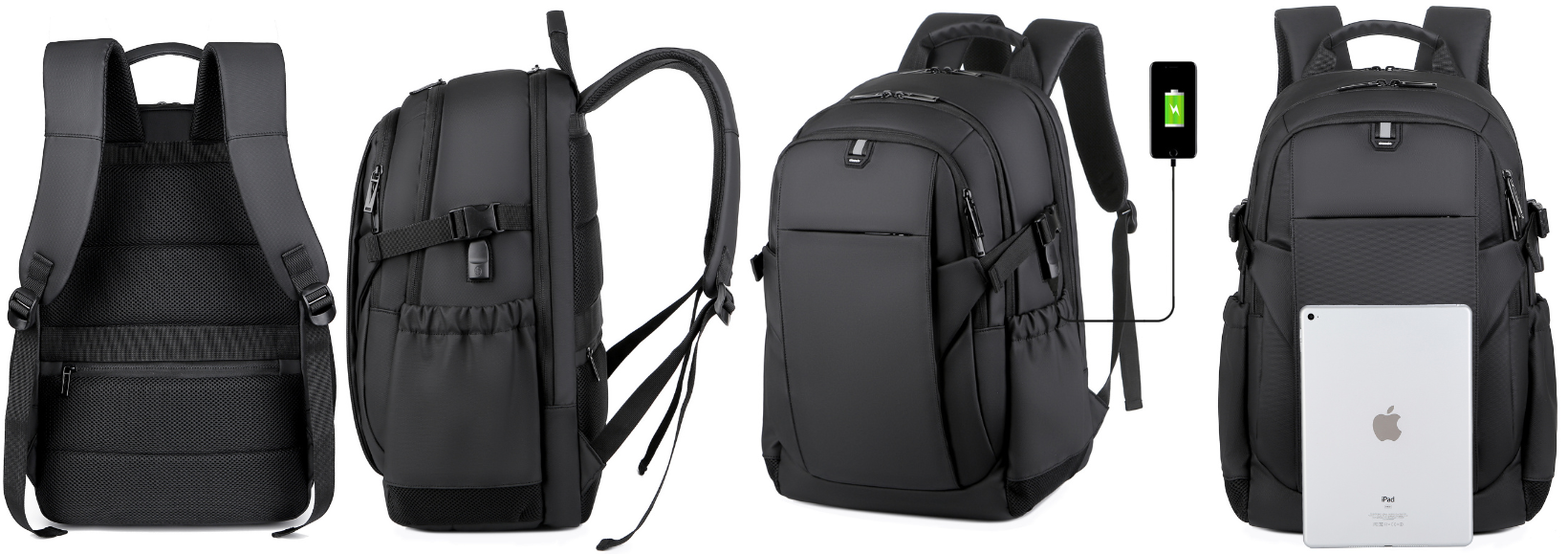 MULTIFUNCTIONAL - Prezinta doua compartimente centrale inchise cu fermoar, cel frontal pentru obiectele mai mici iar compartimentul posterior, care poate fi marit prin deschiderea fermoarului cu 5 cm, este dotat in partea din fata cu patru buzunare deschise pentru portofel, agenda, pixuri, etc iar in partea din spate cu doua buzunare deschise dedicate pentru laptop de pana la 15,6 inch si tableta asigurate cu banda elastica. Rucsacul mai este dotat un buzunar frontal cu fermoar, cu un port USB extern cu cablu de incarcare incorporat (nu include o baterie, aveti nevoie de un acumulator extern pentru a va incarca telefonul) si cu o bareta in spate utila pentru fixarea sa pe manerul trolerului.