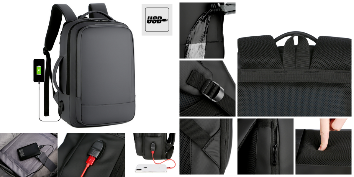 MULTIFUNCTIONAL - Prezinta doua compartimente centrale inchise cu fermoar, cel frontal pentru obiectele mai mici iar compartimentul posterior, care poate fi marit prin deschiderea fermoarului cu 5 cm, este dotat in partea din fata cu patru buzunare deschise pentru portofel, agenda, pixuri, etc iar in partea din spate cu doua buzunare deschise dedicate pentru laptop de pana la 15,6 inch si tableta asigurate cu banda elastica. Rucsacul mai este dotat un buzunar frontal cu fermoar, cu un port USB extern cu cablu de incarcare incorporat (nu include o baterie, aveti nevoie de un acumulator extern pentru a va incarca telefonul) si cu o bareta in spate utila pentru fixarea sa pe manerul trolerului.