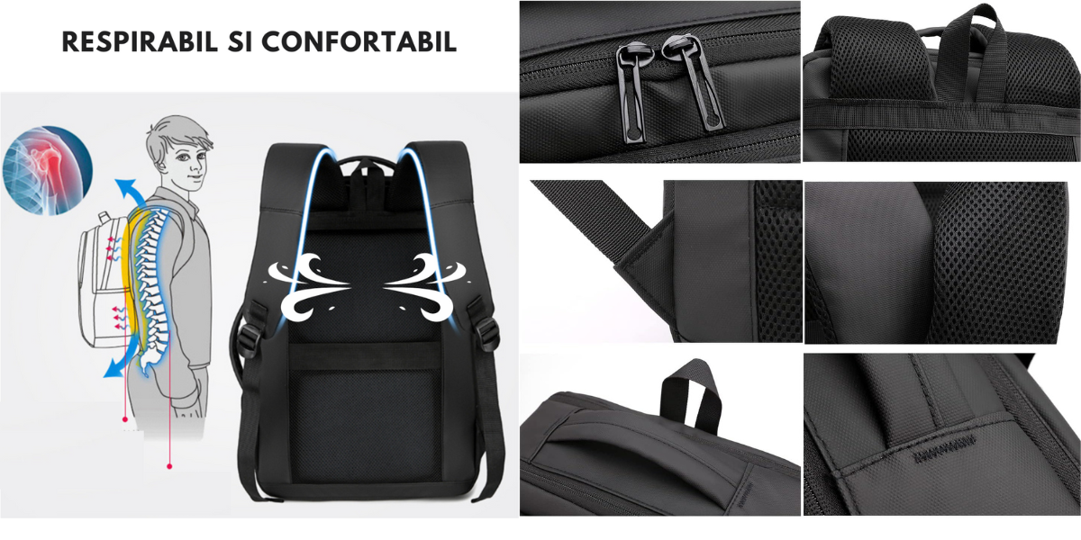 MULTIFUNCTIONAL - Prezinta doua compartimente centrale inchise cu fermoar, cel frontal pentru obiectele mai mici iar compartimentul posterior, care poate fi marit prin deschiderea fermoarului cu 5 cm, este dotat in partea din fata cu patru buzunare deschise pentru portofel, agenda, pixuri, etc iar in partea din spate cu doua buzunare deschise dedicate pentru laptop de pana la 15,6 inch si tableta asigurate cu banda elastica. Rucsacul mai este dotat un buzunar frontal cu fermoar, cu un port USB extern cu cablu de incarcare incorporat (nu include o baterie, aveti nevoie de un acumulator extern pentru a va incarca telefonul) si cu o bareta in spate utila pentru fixarea sa pe manerul trolerului.