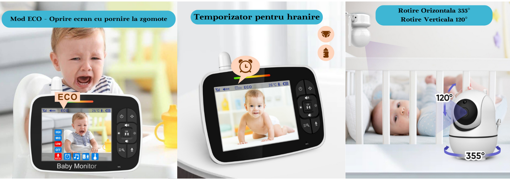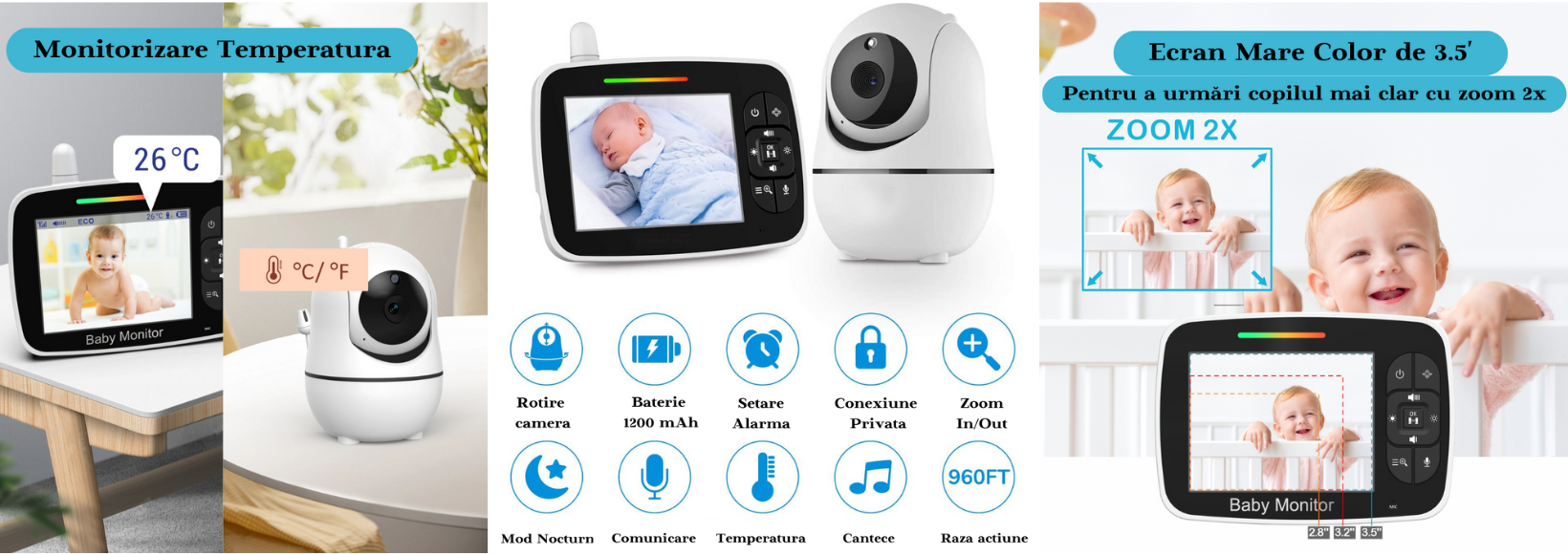 Sistem monitorizare cu Camera Video-Audio pentru supraveghere bebelusi, VisionHub®, Baby Monitor cu Ecran HD 3.5 inch, Monitorizare temperatura, Rotire, Wireless, Cantece Leagan, Interactiune cu Bebelusul, Vedere Nocturna