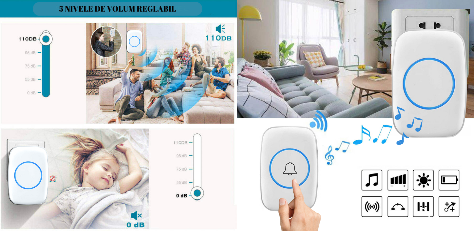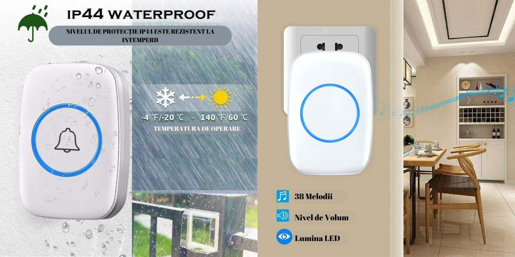 Design elegant, instalare usoara, prietenos cu mediul inconjurator, 60 de tonuri si 5 niveluri de volum (inclusiv optiunea silentioasa), distanta de receptie este mare. Pana la 300 de metri in linie dreapta.