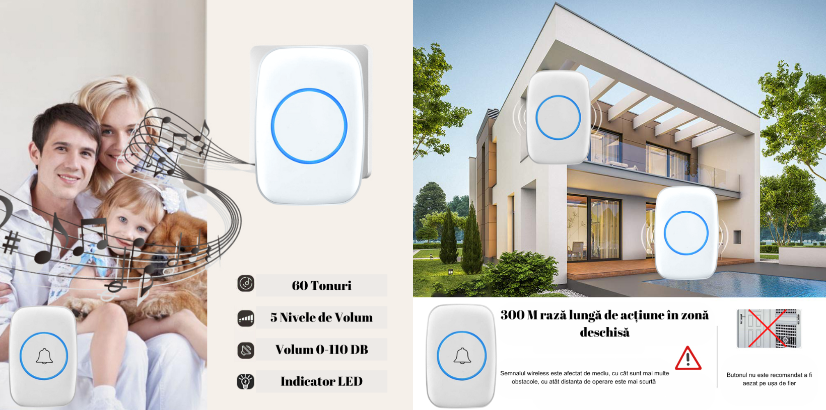 Atentie: Butonul soneriei nu poate fi amplasat pe o usa de fier, deoarece aceasta ii va interfera semnalul.
