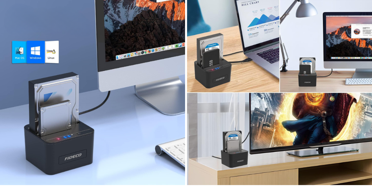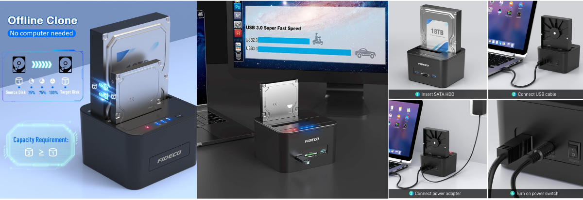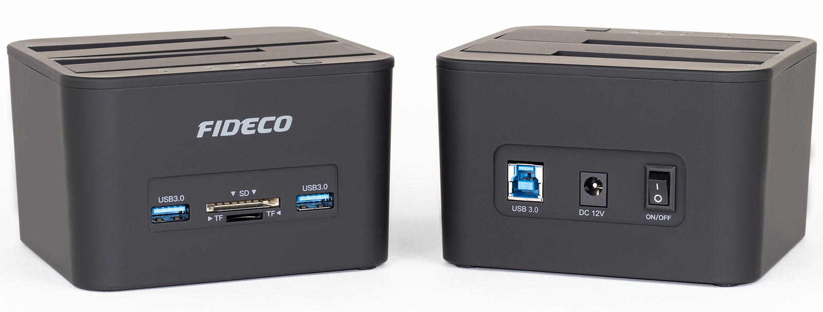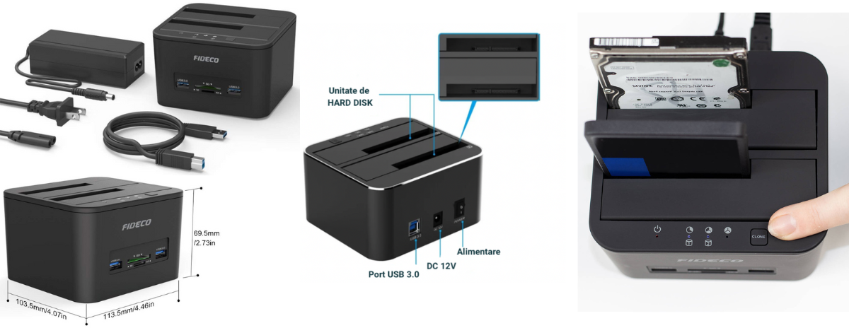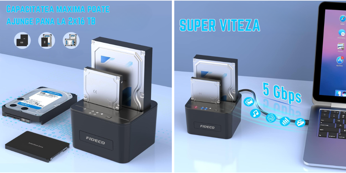 - Statia de andocare HDD: Statia de andocare FIDECO ofera o modalitate usoara de a adauga HDD/SSD la computerul dumneavoastra. Va ofera flexibilitatea de a conecta doua unitati de stocare SATA HDD/SSD de 2.5"/3.5" la computerul dumneavoastra. Conectati si utilizati!