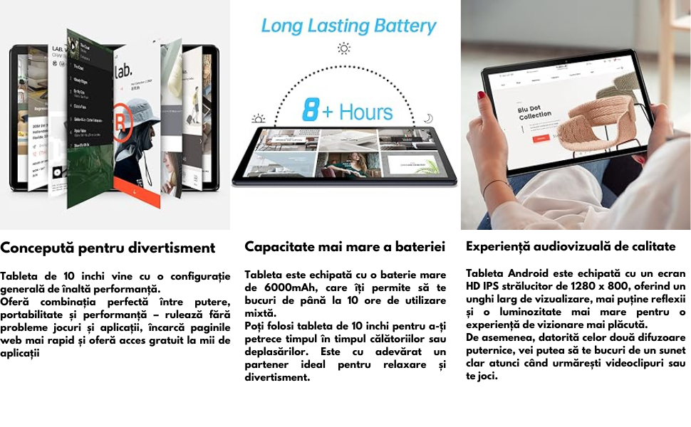 Aceasta tableta vine echipata cu un procesor Quad-Core optimizat pentru performante rapide si multitasking fluid, un ecran HD IPS de 10.1 inchi pentru imagini clare si culori vibrante, precum si o baterie de 6000mAh pentru o utilizare indelungata.