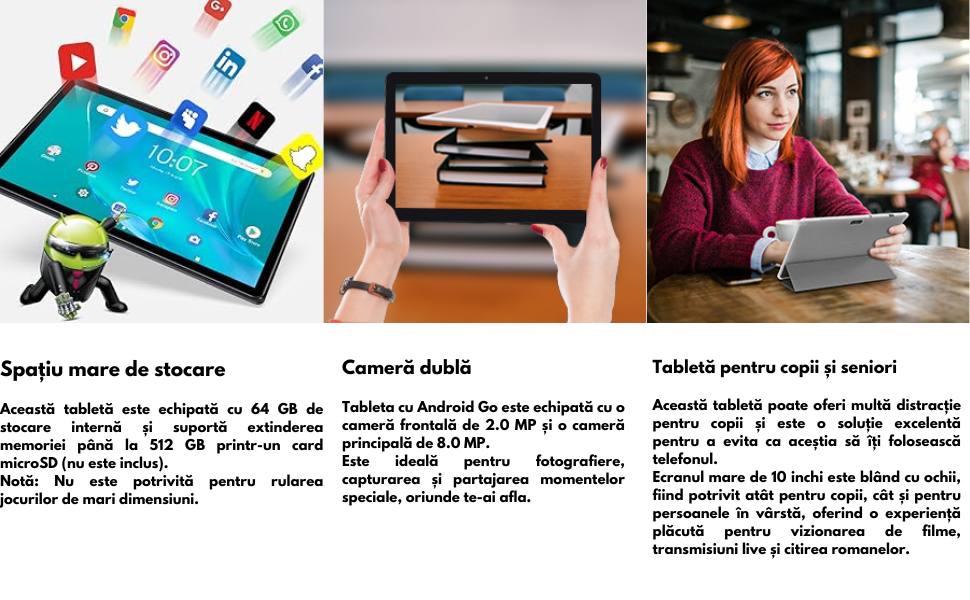 Tableta ofera o capacitate de stocare de 64GB, extensibila pana la 512 GB cu un card microSD, si o memorie RAM de 4GB, ceea ce iti permite sa rulezi aplicatii, jocuri si pagini web fara intreruperi. Este ideala pentru lucru, scoala, streaming video, social media si navigare pe internet.
