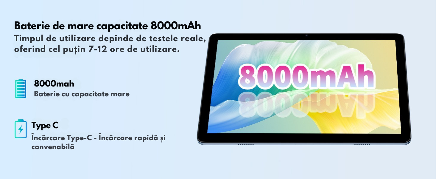 Nu iti mai face griji pentru bateria descarcata! Tableta VASOUN P30 este echipata cu o baterie puternica de 8000mAh, ce ofera o autonomie de pana la 12 ore de utilizare continua, fiind ideala pentru lucru, gaming si divertisment. In plus, incarcarea rapida prin port Type-C asigura o reincarcare eficienta si convenabila.