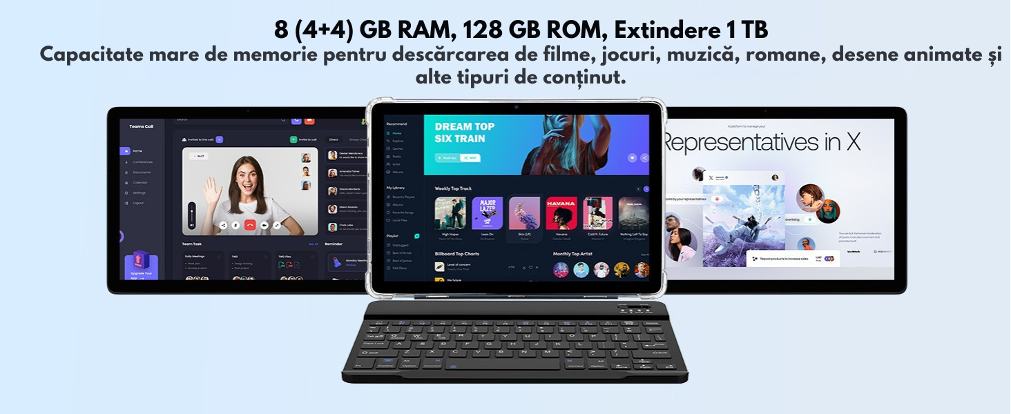 Aceasta tableta este dotata cu 8GB RAM (4GB + 4GB extensibil), oferind o performanta fluida, fara lag, indiferent daca folosesti mai multe aplicatii simultan. Cu 128GB ROM pentru stocare interna si suport pentru card MicroSD de pana la 1TB, ai spatiu generos pentru aplicatii, jocuri, filme, muzica si documente.